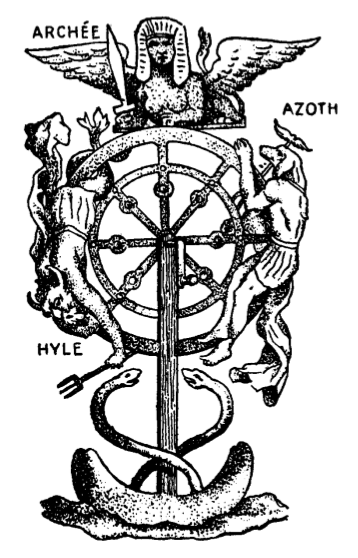 {Illustration on page 108 described: This is sub-titled below “THE TENTH KEY OF THE TAROT”. It is a type of the Wheel of Fortune. The wheel itself is erected on a wooden post, and has a crank affixed to the hub. There is no image of Fortuna to turn it. The base of the post is held by a blunt double crescent on the ground, rounded horns slightly up and in parallel like a hot-dog bun. Two nosed serpents issue from the base, cross once and arch toward the post just below the wheel. The wheel is double, having an outer and an inner ring with eight spokes running through both rims. The spokes have a circular expansion with central hole inside and a bit short of the inner rim. These spokes appear to be riveted to the inner rim. At the top of the wheel is the Nemesis seated on a platform as a sphinx with a sword: head cloth, stern male face and woman’s breasts, winged. The sword is hilt to wheel and up to left. “ARCHEE” is written over the wing to the left. Risking on the right of the wheel is a Hermanubus or variation of Serapis: Dog’s head, human body, carries a caduceus half hidden behind head and wheel, legs before wheel. ”AZOTH” is written above the head of this figure. A demon reminiscent of Proteus descends the wheel on the left. His head is bearded and horned, his legs are tentacular and finned. He carries a trident below. ”HYLE” is written below his head.}