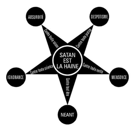 {Illustration on page 285 described: This is a pentagram with point down and a white ring in the center. At the ends of the points are black disks. The pentagram itself is black. There are words in white on the Disks, from the upper right, clockwise: “DESPOTISME”, “MENSONCE”, “NEANT”, “IGNORANCE”, “ABSURDITE”. There are words in white in the points, same order: “Contre toute Justice“, “Contre toute verite”, “Contre toute etre”, “Contre toute science”, “Contre toute raison”. In the central ring in three lines: “SATAN EST LA HAINE”.}