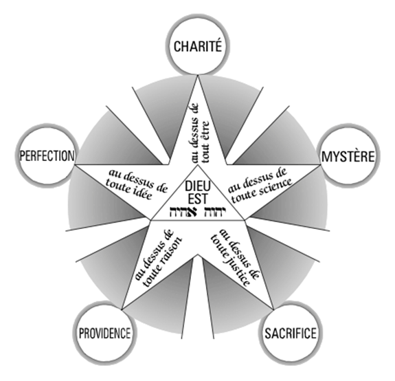 {Illustration on page 286 described: This is a pentagram with an upright isosceles triangle in the midst, lower angles touching the two lower inner angles of the pentagram. There are white disks touching the points from the outside. The pentagram is white and circumscribed by a nimbus having five white wedge-rays coming from the inner angles and opening at the outer edge of the nimbus. The white disks have each a thin nimbus without rays and the following words, clockwise from top: “CHARITE”, ”MYSTERE”, ”SACRIFICE”, ”PROVIDENCE”, ”PERFECTION”. The points have the following text inside, set in script type, same order: ”au dessus de tout etre”, ”au dessus de toute science”, ”au dessus de toute justice”, ”au dessus de toute raison”, ”au dessus de toute idee”. In the central triangle are three lines with the words: ”DIEU EST Yod-Heh-Vau-Heh Aleph-Heh-Yod-Heh.}
