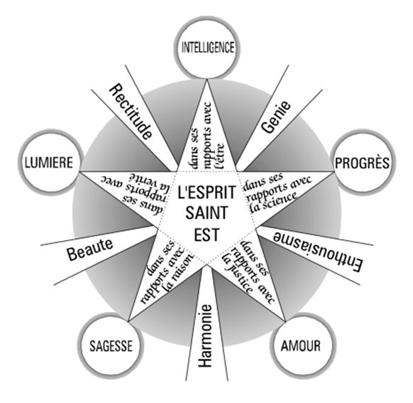 {Illustration on page 287 described: This is in shape exactly the same as the illustration on page 282, save that there are words in the five wedge rays and there is no triangle in the center. Instead, the sides of the pentagram are extended as dotted lines to form an inverse pentagon. The white disks have the following text, clockwise from top: “INTELLIGENCE”, “PROGRES”, “AMOUR”, “SAGESSE”, “LUMIERE”. The points have the following text, same order: “dans ses rapports avec l’ etre”, “dans ses rapports avec la science”, “dans ses rapports avec la justice”, “dans ses rapports avec la raison”, “dans ses rapports avec la verite”. The rays have the following text, clockwise from upper right: “Genie”, “Enthousiasme”, “Harmonie”, “Beaute”, “Rectitude”. The following words are in the center, in three rows: “L’ESPRIT SAINT EST”.}