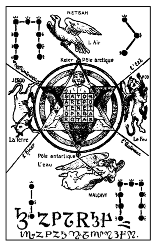 {Illustration on page 288 described: This is bounded by a rectangle with height about twice width. The center of the illustration is composed of a hexagram of two triangles, points to top and bottom. This is circumscribed by a dark ring and surmounts concentric rings inward from the outer one as white, dark, white, dark — at which point the inner angles of the hexagram begin. The upper triangle of the hexagram is light and contains a bearded human head and shoulders at top, feet with draped legs to the lower points. The down-ward pointing triangle has the same in dark with a matching dark figure. Surmounting the center of the hexagram and completely obscuring bodies and arms is the classic Roman Agricultural magical square of five lines: SATOR, AREPO, TENET, OPERA, ROTAS. The outer points of the hexagram extend lines radially to irregularly divide the space to the rectangular border, upper and lower points excepted. Above the upper point are the words “Keter Pole arctique” and there is a nob at that spot with a line pulled diagonally upward to the left by an eagle, facing counter clockwise. Above the eagle is the word “NETSAH”, to the right “L Air”. The line from the upper right point has “l’ Ete” above it and the figure of a winged lion below, facing outward and progressing upward. The lion has “HOD” written to the right of its head and vertically extended left foreleg, “Le Feu” below its tail and downwardly extended right hind leg. The line from the lower right point is below this figure, and “l’ Automne” is below this line. The line from the upper left point has “les Printemps” written above it. Below this is a bull, no wings and facing downward. ”JESOD” is above the bull’s tail, and ”La Terre” is below the head. Next below is the line from the lower left point, with “l’ hiver” below that. Below the lower point are the words “Pole antartique” and “L’ eau”. There is a nob at that spot, with a winged angel facing right and pulling the nob with a diagonally downward line to the right. “MALCHVT” is written below the Angel. The letters “HB:Yod” “HB:Heh ” “HB:Vau ” “HB:Heh ” are picked out by dots with three clustered radial dashes in or near the four corners, starting with the upper right (clockwise or counter-clockwise makes no difference). These dot-letters are the late Medieval style, and either represent stars or fires. The Hebrew letters are formed by straight line segments connecting the dots. The Hay’s have three dots to the upper bar: ends and center with the dashes to the top. The verticals on the Hays have three dots and join the upper bar to add a fourth, with the three having their dashes facing outward. The Yod is composed of two lines, dots at ends and intersection. Dashes at top vertical, center dot dashes to the right and lower dot dashes to left. The Vau has three dots, ends and center with dashes in same directions as the Vau. The figure is completed by two lines of flourished symbols at the bottom: Larger upper line looks like: 3 or h (bottom end of corner Vau) Z P 7 R 3(or h) 4 (reversed), but is intended to represent the seven planets starting with Saturn and ending with Jupiter.. The smaller lower line looks like: M Z P Z 3(or h) N 7 M N 3(or h) F (reversed) N, but is intended to represent the twelve signs of the Zodiac. These symbols are somewhat doubtful in identity, owing to the obscuration of using letter and number shapes to conceal the standard Astrological symbols and to the jumbled sequence.}