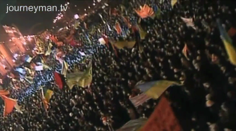 [Narrator] Gene Sharp taught for many years at Harvard University. His work describes various strategies, from hunger strikes to the unmasking of intelligence officials. His assistant, Jamila Raqib, is responsible for distributing Sharp's work. "From Dictatorship to Democracy" has been translated into 34 languages. [Jamila Raqip, Albert Einstein Institute] This booklet is the Arabic version of "From Dictatorship to Democracy," which is one of Gene Sharp's most important and widespread publications. It's been disseminated very, very widely, this Arabic version. So a few years ago, maybe perhaps 2 years ago, an individual had it printed by a publishing house in Beirut. [Narrator] Sharp's guide to revolution is feared by dictators around the world. Venezuela's President Chavez called Sharp a rabblerouser in the service of the CIA. In Russia, possession of the book is considered a hostile act against the government. [Gene Sharp, Author] The manuscript for that was at a printer in Moscow, and the FSB, the successors to the KGB, arrived and said, "What is this?" And looked at it and said, "This is a bomb! Stop the presses immediately." The presses were stopped. The people took the translation away with them, they went to a printer outside of Moscow and got it printed, and brought the copies back in. They wouldn't sell that book except in two bookstores in Moscow. It was in two or three weeks mysteriously caught on fire. [Narrator] Now, with the Internet, anybody has access to Sharp's revolution strategies. [William Engdahl, Author] It's what Mr. Sharp one time called, "Non violence as a method of warfare." And they are going in every place since the end of the Cold War to destabilize regimes which offer resistance to this larger agenda, the globalization agenda, as Washington defines it. [Narrator] So are all of these revolutions actually initiated by the Americans? We can look back at what happened during the Orange Revolution in the Ukraine for evidence. The events that took place in Kiev in 2005 appear to endorse this assumption. Traditionally, the Ukraine was part of Russia, but by the end of 2004 the tide had turned. The United States pumped millions of dollars into the opposition movements in favor of regime change. We are meeting with the two former leaders of the Ukraine revolution. Just by being a member of the opposition movement, Pora, they received significant sums of money, together with training in civil disobedience. Finally, they were given the book. [Mychailo Swystowitsch, Former Ukraine Activist] Oh yes, the book by Gene Sharp. We all used it. And it connected us with everybody. Without Pora in Serbia, the opposition movement in Belarus and Kmara in Georgia, ... [Narrator] It was in November, 2004, when hundreds of thousands of people flooded Independent Square in Kiev and demanded Viktor Yushchenko for their president. At the end of the revolution, the crowd got what they demanded. Yushchenko became president due to the massive support he received from the Western World. [Dmytro Poteschin, Political Consultant] We had a number of great examples of dramatizing, as well as having fun on the streets. [Narrator] The revolution as a celebration. This is the spirit of Gene Sharp. Every movement becomes a brand with its own symbolism. Oranges in Ukraine, the Rose Revolution in Georgia, the Tulip Revolution in Kyrgyzstan, the Denim Revolution in Belarus. All different symbols, but with the same concept and the same sponsor: The United States of America. [Dmytro Poteschin, Political Consultant] In my case, in 2004 I was heading a water [inaudible] campaign with budget of $1 million bucks. [Reporter] $1 million dollars? [Dmytro Poteschin, Political Consultant] Yes. That's not because American taxpayers wanted to protest Yanukovych, but because Yanukovych tried to steal the vote. The United States and the European Union and others, they are serious about democracy. [Narrator] After the revolution in Ukraine, Dmytro Poteschin made a career from being a former activist. He now works as a revolution trainer. From his flat, he instructs the opposition movements in Iran, Russia, Belarus, and Egypt. Via Skype he's able to stay in touch with all his clients. [Dmytro Poteschin, Political Consultant] In principal, it's possible to trace it, but it will need much more human resources and time for every single connection. [Narrator] An activist from the opposition movement in Belarus is online. Dmytro is planning a workshop over there which is not without its difficulties, as he is labeled persona non grata by the Belarus government. [Dmytro Poteschin, Political Consultant] I got the feeling that actually it's like a concentration of a number of conflicts which cannot be resolved without mobilization. And it looks like it can happen the way it happened in Egypt. Some smaller country, like Belarus, for instance, or Ukraine. And then we can get Russia. [Narrator] Back in Belgrade, OTPOR trainer Ivan Marovic proudly presents his new gadget for resistance training. It's a computer game that simulates the fight against the power of the State. Ivan is sure that the game will make his training much more effective. Sponsorship for the development of the game came from American organizations. [Ivan Marovic, Co-Founder of OTPOR] The game, downloaded on the Internet or smuggled on a CD, can reach people that we personally cannot. And so that obstacle is removed. And another thing is the question of scale. You know, personally I can meet up to 150 people a year if I work full-time. The game can actually reach a much, much bigger number of people. The tactics of mass protest, occupying buildings, blocking the whole city, you know, but you're trying to kind of galvanize people, like rock concerts, to come. And then you use that opportunity to recruit, and etc., etc. [Narrator] Marovic argues that the new generation doesn't want to read books. They would prefer to play video games. And it's far more effective. 