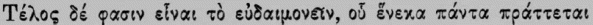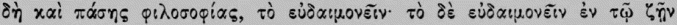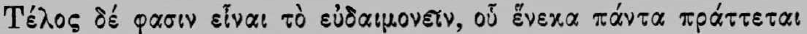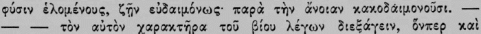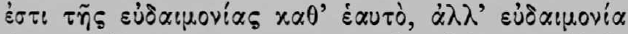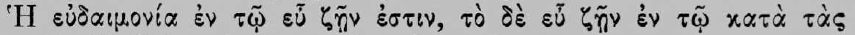 reason it is chosen by the prudent man. Hence we get the lengthy debates preserved for us especially by Cicero, those keen and constantly renewed investigations as to whether virtue, entirely alone and of itself, is really sufficient for a happy life, or whether something external is also required for this; whether the virtuous and the prudent are happy even on the rack and wheel or in the bull of Phalaris; or whether it does not go as far as this. For this of course would be the touchstone of an ethical system of this kind, that the practice of it would inevitably and necessarily produce happiness immediately and unconditionally. Unless it can do this, it does not achieve what it ought, and is to be rejected. Consequently, it is as correct as it is in accordance with the Christian point of view for Augustine to preface his exposition of the moral systems of the ancients (De Civitate Dei, Bk. xix, c. 1) with the explanation: Exponenda sunt nobis argumenta mortalium, quibus sibi ipsi beatitudinem facere IN HUJUS VITAE INFELICITATE moliti sunt; ut ab eorum rebus vanis spes nostra quid difjerat clarescat. De finibus bonorum et malorum multa inter se philosophi disputarunt; quam quaestionem maxima intentione versantes, invenire conati sunt, quid efficiat hominem beatum: illud enim est finis bonorum. [7] I wish to place beyond doubt by a few express statements of the ancients the declared eudaemonistic purpose of the ethics of antiquity. Aristotle says in the Magna Moralia,
