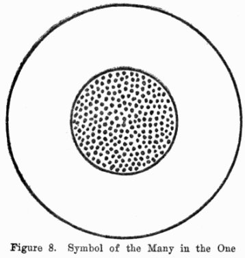 PART 5: THE ONE AND THE MANY How the One Becomes the Many. How Unity Becomes Diversity. How the Identical Becomes Variety. No Separation Possible to Unity. The Manifold Reflection of the One Reality. The Falling Raindrops. The Jars of Water. The Ocean of Being and Its Bubbles. Absolute Being Is One. Relative Being Is Apparently Many. Monism. Involution and Evolution. The World Soul and Its Material Garments. The Descent into Matter. The Ascent from Matter. The Spiral Stairway of Being. Sub-Mineral Forms. Mineral Forms. Plant Forms. Animal Forms. Human Forms. Superhuman Forms. God-like Forms. How the One Apparently Becomes Many, and Yet Remains One to Reality. The Paradox of Being. In the Secret Doctrine of the Rosicrucians, we find the following Fourth Aphorism: The Fourth Aphorism 4. The One becomes Many. The Unity becomes Diversity. The Identical becomes Variety. Yet the Many remains One; the Diversity remains Unity; and the Variety remains Identical. In this Fourth Aphorism of Creation, the Rosicrucian is directed to apply his attention to the concept of the World Soul—the First Manifestation of the Eternal Parent—as a One Manifesting as Many; a Unity manifesting as Diversity; an Identical manifesting as Variety: yet, notwithstanding such manifestations, remaining ever One, Unity, and Identical. This concept of the World Soul, so manifesting itself in Manifoldness, Diversity, and Variety, yet ever remaining One, Unity, and Identical, is represented by the Rosicrucians by the symbol of a small circle within a larger circle, the smaller circles being filled with tiny points or centres of manifestation. The outer circle is, of course, the Infinite Unmanifest; the smaller circle, of course, being the World Soul; and the small dots, or points, being the individualized centres of life, being, and activity manifested by the World Soul. That all beings are, in truth, but expressions of the One Being—centres of consciousness, form, and activity within itself,—is a fundamental tenet of all occult and esoteric teaching. That all Being is One; all Life, One; all Form, One; all Consciousness, One, is known to all true disciples of the occult and esoteric teachings of the past and present, occidental and oriental, philosophical and theological. Hidden behind and under the orthodox, exoteric teachings, there is always to be found this insistence upon Essential Oneness on the part of the Inner Teachings of all schools. Figure 8. Symbol of the Many in the One That there is but One Life, and not Many Lives, is a fundamental article of all occult and esoteric faith. The One Life, moreover, is not to be thought of as dividing and splitting itself up into bits, parts, and particles, in order to accomplish the process of Creation, and the Manifestation of the World. Instead, it is to be thought of as merely reflecting itself in the many individual mirrors of expression, just as the sun reflects itself as One in the millions of falling raindrops, or in a million tiny jars filled with water. There are millions of reflections of the One, but only the one One in reality. Or, using another figure of speech, the One may be thought of as an Infinite Ocean of Being, in which there are millions of tiny bubbles, each apparently apart and separate, but all of which are in reality, but centres of activity and expression in the One Great Ocean. Separateness is, to quote a writer, "but the working fiction of Creation." All the apparently separated Things are contained within the circle of the World Soul—and the latter is contained within the circle of the Infinite Unmanifest. Not only is this esoteric conception of the Many in One, and the One in Many, a fundamental conception of the ancient esoteric and occult teachings, but the same truth in another form is presented by advanced modern science in its conception of the Universal Substance. Science postulates the existence of a Universal Substance, known under many names, from which all Things proceed. It matters not whether this Universal Substance be called "Primordial Substance," or "Infinite and Eternal Energy," or "The Universal Ether," the fact remains that science postulates its existence as a fundamental, substantial Something, of and in which all forms and phases of phenomenal existence are but manifestations. In the same way, those schools of transcendental philosophy which postulate the existence of a Universal Mind teach that all forms and phases of phenomenal existence are but Thought Forms in the Universal Mind. And the old Brahmanical teachings likewise hold that the Many exist but as incidents of the "dream" or "meditation" of the Lord High Brahma. In all forms, phases, and schools of philosophy we find this insistence upon the presence and existence of a One Something of which all else are but manifestations. In fact, as the wisest philosophers have informed us, the whole purpose of philosophy is to discover the One Unconditioned Ground of all that exists Conditionally. All philosophy worthy of the name is Monistic in essence. A leading authority on the history of philosophy informs us the: "Monism is, in strictness, a name applicable to any system of thought which sees in the universe the manifestation or working of a single principle. Such a unity may be at once the tacit presupposition and the goal of all philosophic effect, and in so far as a philosophy fails to harmonize the apparently independent and even conflicting facts of experience, as aspects or elements within a larger whole, it must be held to fall short of the necessary ideal of thought. Dualism, in an ultimate metaphysical reference, is a confession of the failure of philosophy to achieve its proper task; and this is a justification of those who consistently use the word as a term of reproach." And, now, let us take a brief passing glance at the Rosicrucian teachings concerning the manner in which the One proceeded to become the Many—the Unity to become Diversity—the Identi