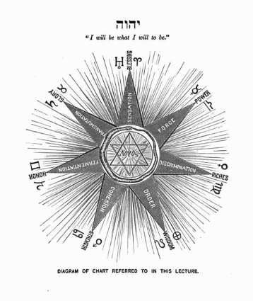 We know that we cannot move a muscle without the consent of the will. We talk about the involuntary action of the system, but such action is nothing more or less than the movement by the will in accordance with an established habit of being. Every possible action of our organization may, by the effort of our own will, be suspended; and investigation has proved that there are those who are capable of suspending every action or function of the system, even bringing the involuntary activities under control of the will. Thus habit, being induced through the operation either of one's own will or of that of the parent organism, may again be dominated by the same agency. Continued practice causes the hand of the mechanic or musician to act in as regular and systematic manner as do any of the apparently involuntary muscles. I have seen men execute the most intricate mechanical work, that which required the utmost nicety and exercise of fine artistic sense, such as could be attained only by long and untiring application, without any apparent thought or attention. Therefore, we see that the will not only establishes but corrects and controls habits, and is the dominant power and ruler of all. In our search after God it becomes necessary to look within and beyond. We therefore proceed in accordance with this law in our analysis of the highest form of earthly organization; namely, man. When we have ascertained what man actually is, we begin to form a rational, in fact the highest possible, conception of how and from whence he originated. Let us turn our attention to the old cabalistic name Yahveh, which I have chosen to place on this chart (see diagram) as representing the cause of the seven creative principles, which we shall discuss in subsequent lectures. This (pointing to the chart) is the Hebrew word Yahveh. It occurs over sixty-four hundred times in the Hebrew Bible. It is translated, I think, in our version but four times, in three of which it is rendered as Jehovah, and in the fourth as Jah or Yah; and you will notice in the English translation of the Scriptures, that wherever the name of the Deity is used, when derived from Yahveh, it is invariably spelled with capital letters. This word Yahveh, the cabalistic name for GOD, means, "I will be what I will to be." You will see that this expresses supreme ability and indomitable potency. Who among the sons of men dare step forward and say, "I will be what I will to be"? Think of it! not merely implying, but asserting, that the ability to be whatever he wills to be exists in himself. Here we have a foundation thought, and here I will say, that in this "I will be what I will to be" we find the key to the whole Hebraic Scripture. Now let us look and see what a subtle power the will is. We will, and we move; or the will may be excited, and we say that we are angry; and when the will is excited to anger, what a storm exists in the body! how the red blood mounts to the face! every nerve is strained to its utmost tension! what an abnormal strength is called into being to resist and overcome obstacles! And thus even the weakest organizations are by this power of the aroused will enabled to assert and maintain their right (or possibly wrong) at all hazard. Thus you see that the will is the absolute monarch, ruling every muscle and nerve, governing every thought; and that every other power in man is subservient to this king, THE WILL. Let us look still further, and turn our attention to this planet, earth. It is relatively but a little ball revolving around the sun, its great centre of light. It has eight companions, — yes, more; there is a large family of worlds, each revolving around the same centre, each following in its own prescribed orbit. Here we must become conscious that there is a great power that causes these worlds to revolve around their common centre, each travelling in its defined orbit; and then we find that our centre, the sun, is but a planet of a greater and grander system, and is, with its family of worlds, revolving around another sun; and further still, that this third sun and its family of worlds, is travelling around another sun of a still greater and grander system, so great and grand that it is supposed by some that to complete one revolution consumes over twenty-two and a half million of our years. Here the telescopic deductions of man now cease. But do mathematics cease here? We think not. There are mathematical methods by which it can be proven that all these worlds are born from a great central sun; and that as they are farther and farther removed from it, they become finer and more ethereal, are more fully developed by the same law of transmutation and change that we observe in our planet, the earth; which earth is but an immense electric machine, generating currents of electricity and magnetism which bind it to its sun. The material elements are being transmuted to finer essences of being, and in these worlds born from the central sun we find that they are getting finer and less physically strong in their currents; therefore they are drifting farther away from their centre. If we will investigate our planet, the earth, we shall find that it is becoming finer and less strong physically; that every generation of its inhabitants is becoming more refined than its predecessor. Look back for a few generations, and see what a different character they bore from the people of today; how much weaker are we in muscle, how much stronger in brain; how much greater flights of thought are being taken today than in years long ago. Thus thought and mental power are gaining, while physical energy is decreasing. Thought is the co-worker of the will; it is not the will, but is submissive to its power: we think, and consequently act. But there are powers that can overcome the mandates of our will: for instance, let us take electricity. Suppose you take hold of the poles of a strong electric battery, put your will to work and say you will hol