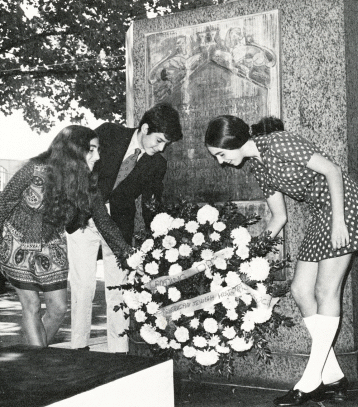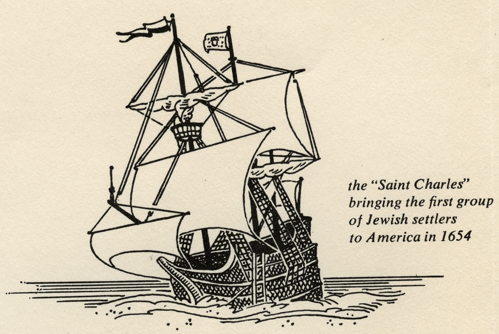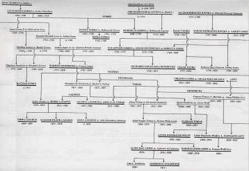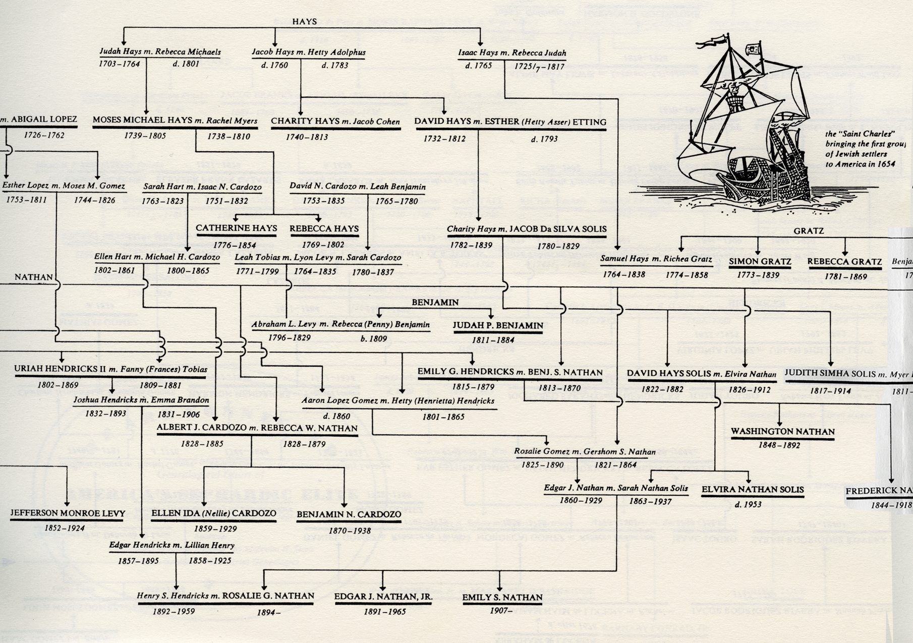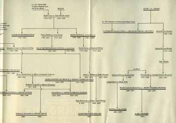 Mr. Julian Nathan, elegant young New Yorker, in Central Park with cart and groom. Museum of the City of New York Cousin Florian Tobias, who enjoyed leisure, worked at nothing; with George, his chauffeur, and "the first automobile in Saratoga," circa 1900. Courtesy of Mrs. Lafayette A. Goldstone. Barnard College founder Annie Nathan Meyer, as a girl of about fifteen. Barnard College Archives Annie Nathan Meyer in later years. Barnard College Archives Maude Nathan Nathan (she married a cousin), and her husband, bound for a costume ball In 1970, three direct descendants of the Twenty-Three placed a commemorative wreath on the plaque erected in downtown Manhattan to mark the spot where the first Jews entered the New World. From left, the children are Sara Ellen Nathan, daughter of Mr. and Mrs. Edgar J. Nathan III, Henry Hendricks Schulson, son of Mr. and Mrs. Hyman A. Schulson; and Jean Elson Nathan, daughter of Mr. and Mrs. Frederic Da Silva Solis Nathan. B & G International Photos "WE ARE CONNECTED". An Abbreviated Genealogical Chart of AMERICA'S SEPHARDIC ELITE. Capitalized names are treated in the text. Sources: "Americans of Jewish Descent" by Malcolm H. Stern and L.A. Goldstone Manuscript Genealogies The "Saint Charles" bringing the first group of Jewish settlers to America in 1654