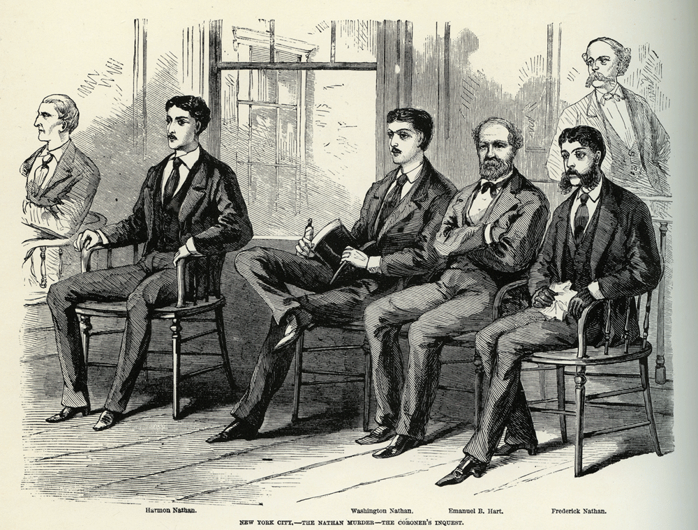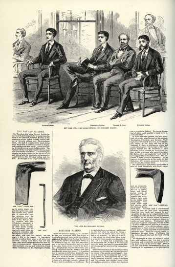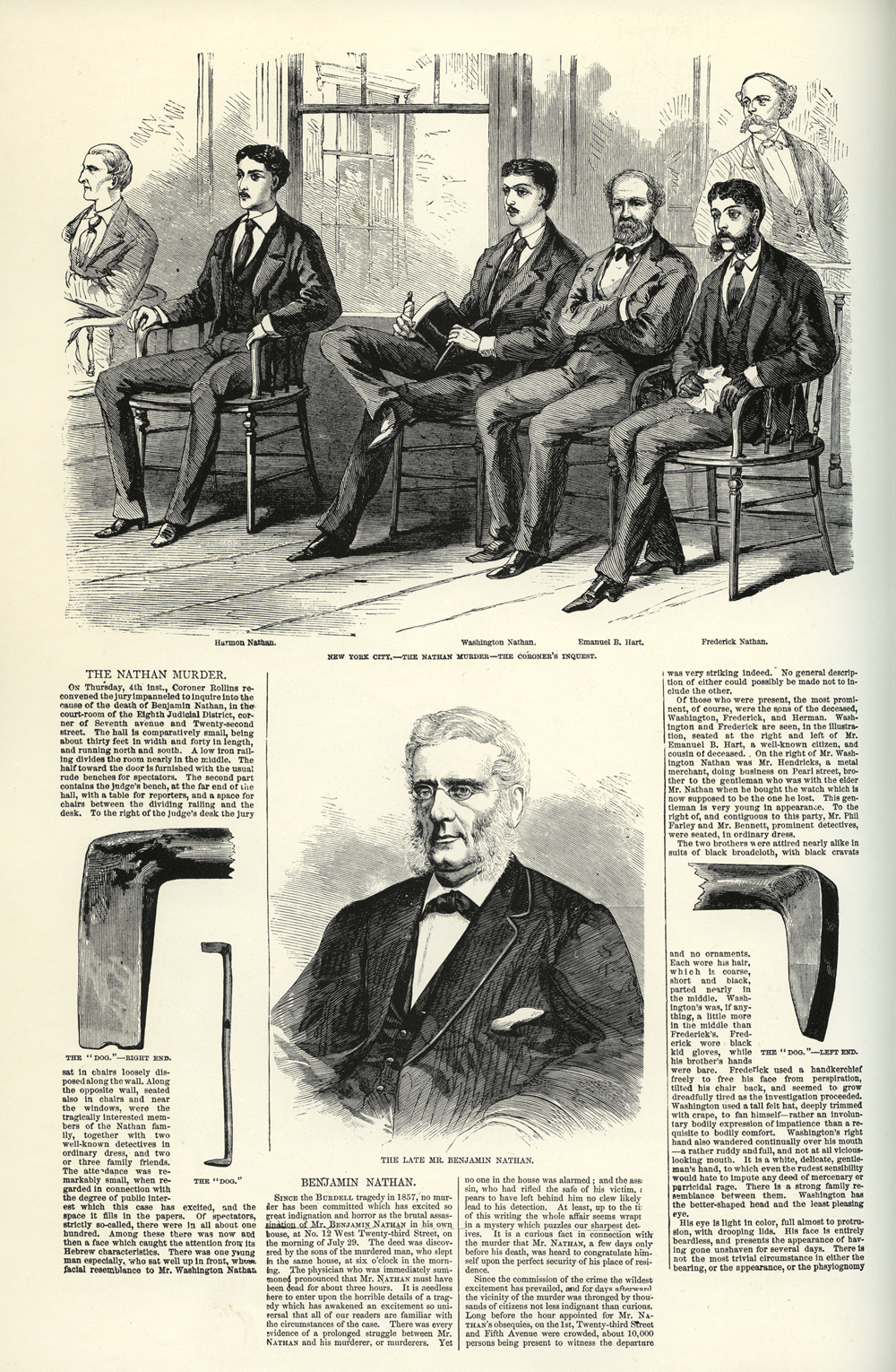 Harmon Nathan, Washington Nathan, Emanuel B. Hart, Frederick Nathan The murder of kindly Benjamin Nathan created a national sensation. Washington Nathan (seated at center above, holding his hat) was accused of bludgeoning his father with the carpenter's "dog." Culver Pictures, Inc. THE NATHAN MURDER. On Thursday, 4th inst., Coroner Rollins reconvened the jury impanneled to inquire into the cause of the death of Benjamin Nathan, in the court-room of the Eighth Judicial District, corner of Seventh avenue and Twenty-second Street. The hall is comparatively small, being about thirty feet in width and forty in length, and running north and south. A low iron railing divides the room nearly in the middle. The half toward the door is furnished with the usual rude benches for spectators. The second part contains the judge's bench, at the far end of the hall, with a table for reporters, and a space of chairs between the dividing railing and the desk. To the right of the judge's desk the jury sat in chairs loosely disposed along the wall. Along the opposite wall, seated also in chairs and near the windows, were the tragically interested members of the Nathan family, together with two well-known detectives in ordinary dress, and two or three family friends. The attendance was remarkably small, when regarded in connection with the degree of public interest which this case has excited, and the space it fills in the papers. Of spectators, strictly so-called, there were in all about one hundred. Among these there was now and then a face which caught the attention from its Hebrew characteristics. There was one young man especially, who sat well up in front, whose facial resemblance to Mr. Washington Nathan was very striking indeed. No general description of either could possibly be made not to include the other. Of those who were present, the most prominent, of course, were the sons of the deceased, Washington, Frederick, and Herman. Washington and Frederick are seen, in the illustration, seated at the right and left of Mr. Emanuel B. Hart, a well-known citizen, and cousin of deceased. On the right of Mr. Washington Nathan was Mr. Hendricks, a metal merchant, doing business on Pearl street, brother to the gentleman who was with the elder Mr. Nathan when he bought the watch which is now supposed to be the one he lost. This gentleman is very young in appearance. To the right of, and contiguous to this party, Mr. Phil Farley and Mr. Bennett, prominent detectives were seated, in ordinary dress. The two brothers were attired nearly alike in suits of black broadcloth, with black cravats and no ornaments. Each wore his hair, which is coarse, short and black, parted nearly in the middle. Washington's was, if anything, a little more in the middle than Frederick's. Frederick wore black kid gloves, while his brother's hands were bare. Frederick used a handkerchief freely to free his face from perspiration, tilted his chair back, and seemed to grow dreadfully tired as the investigation proceeded. Washington used a tall felt hat, deeply trimmed with crape, to fan himself -- rather an involuntary bodily expression of impatience than a requisite to bodily comfort. Washington's right hand also wandered continually over his mouth -- a rather ruddy and full, and not at all vicious-looking mouth. It is a white, delicate, gentleman's hand, to which even the rudest sensibility would hate to impute any deed of mercenary of patricidal rage. There is a strong resemblance between them. Washington has the better-shaped head and the least pleasing eye. His eye is light in color, full almost to protrusion, with drooping lids. His face is entirely beardless, and presents the appearance of having gone unshaven for several days. There is not the most trivial circumstance in either the bearing, or the appearance, or the physiognomy The late Mr. Benjamin Nathan BENJAMIN NATHAN. Since the Burdell tragedy in 1857, no murder has been committed which has excited so great indignation and horror as the brutal assassination of Mr. Benjamin Nathan in his own house, at No. 12 West Twenty-third Street, on the morning of July 29. The deed was discovered by the sons of the murdered man, who slept in the same house, at six o'clock in the morning. The physician who was immediately summoned pronounced that Mr. Nathan must have been dead for about three hours. It is needless here to enter upon the horrible details of a tragedy which has awakened an excitement so universal that all of our readers are familiar with the circumstances of the case. There was every evidence of a prolonged struggle between Mr. Nathan and his murderer, or murderers. Yet no one in the house was alarmed; and the assassin, who had rifled the safe of his victim, appears to have left behind him no clew likely to lead to his detection. At least, up to the time of this writing the whole affair seems wrapped in a mystery which puzzles our sharpest detectives. It is a curious fact in connection with the murder that Mr. Nathan, a few days only before his death, was heard to congratulate himself upon the perfect security of his place of residence. Since the commission of the crime the wildest excitement has prevailed, and for days afterward the vicinity of the murder was thronged by thousands of citizens not less indignant than curious. Long before the hour appointed for Mr. Nathan's obsequies, on the 1st, Twenty-third Street and Fifth Avenue were crowded, about 10,000 persons being present to witness the departure The "Dog" -- right end. The "Dog" -- left end.