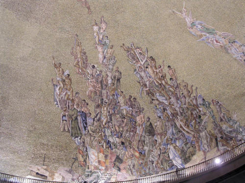 by Wikipedia Santa Cruz del Valle de los Caídos, view from the esplanade. The Valle de los Caídos (in English: Valley of the Fallen) is a monumental memorial in the municipality of San Lorenzo de El Escorial, erected at Cuelgamuros Valley in the Sierra de Guadarrama, near Madrid, conceived by Spanish dictator Francisco Franco to honour those who fell during the Spanish Civil War. However, only two names are commemorated— those of José Antonio Primo de Rivera and Franco himself.[1] It was also claimed by Franco that the monument was meant to be a "national act of atonement". As a surviving artifact of Franco's rule, the monument and its Catholic basilica remain controversial, especially due to the manner and circumstances of its construction (built by political prisoners). Basilica, cross and abbey Rising above the valley is one of the world's largest basilicas, Basílica de la Santa Cruz del Valle de los Caídos (Basilica of the Holy Cross of the Valley of the Fallen), hewn out of a granite ridge, and the tallest memorial cross in the world, a 152.4-metre-high construction of stone. In 1960, Pope John XXIII declared the underground crypt a basilica. The dimensions of the underground basilica, as excavated, are larger than those of St. Peter's Basilica in Rome. To avoid competition, a partitioning wall was built near the inside of the entrance and a sizable entryway was left unconsecrated. Dome inside the Basilica The shrine, a landmark in 20th-century Spanish architecture, was designed by Pedro Muguruza and Diego Méndez on a scale to equal, according to Franco, "the grandeur of the monuments of old, which defy time and forgetfulness". It is laid out in uniquely Spanish Neo-Herrerian style, which was intended as a revival of Juan de Herrera’s classicist architecture, exemplified in El Escorial. This architecture was widely used in public buildings of post-war Spain and is rooted on the International classicism exemplified by Albert Speer or Mussolini's Esposizione Universale Roma. The monumental hieratic sculptures over the main gate and the base of the cross culminated the career of Juan de Ávalos. The monument consists of a wide explanada (esplanade) with a spectacular view of the valley and the outskirts of Madrid in the distance. A long vaulted crypt was tunnelled out of solid granite by thousands of Republican military prisoners. It pierces the mountain to the massive transept, which lies exactly below the cross. On the wrought-iron gates, Franco's neo-Habsburg double-headed eagle is prominently displayed. On entering the basilica, visitors are flanked by two large metal statues of art deco angels holding swords. There is a