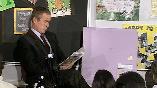 _______________ See Michael Moore's "Fahrenheit 911" [Michael Moore] As the attack took place, Mr. Bush was on his way to an elementary school in Florida. When informed of the first plane hitting the World Trade Center where terrorists had struck just eight years prior, Mr. Bush decided to go ahead with his photo opportunity. [Teacher] Good morning, boys and girls. [Students] Good morning. [Teacher] Read this word the fast way. Get ready. [Students] "Mad"! [Teacher] Yes. Get ready. [Students] "Calf"! [Bush] Yeah. [Teacher] Okay, get ready to read the words on this page without making a mistake. [Michael Moore] When the second plane hit the tower his chief of staff entered the classroom and told Mr. Bush, "The nation is under attack." Not knowing what to do, with no one telling him what to do, and no Secret Service rushing in to take him to safety, Mr. Bush just sat there and continued to read My Pet Goat with the children. See "First Lady Talks About Horse Penises, Harvests Accolades," by Charles Carreon See "Unauthorized Biography of George Bush," by Webster G. Tarpley & Anton Chaitkin: "Mr. Bush got off Air Force One looking tired, eyes puffy and his stride less spry than the 'spring colt' to which he always compares himself." See "Peter Levenda and the Magickal Roots of Nazism," interview by Tracy R. Twyman See The Hitchhiker's Guide to the Galaxy, Mutant Star Goat Vignette That's not what I was told. My commander swore that the entire planet was about to be eaten by a mutant star goat. See "The Prosecution of George W. Bush for Murder," by Vincent Bugliosi How did Bush respond to this moment of great crisis, the first deadly attack by foreigners on American soil in our history? If we didn't know what he did, no one could possibly believe it. It is so incredible that I am certain one would be extremely hard-pressed to find one other person out of a million -- but certainly no public official of any rank, much less another president of the United States -- who would have responded the way he did. At 8:55 on the morning of September 11, 2001, Condoleezza Rice, the president's national security adviser, informed Bush over the telephone that a plane had hit one of the Twin Towers of the World Trade Center. He was then told this in person by his chief of staff, Andrew Card, before he walked into the Emma E. Booker Elementary School in Sarasota, Florida, at 9:04 a.m. He would have had no way of knowing at this point that it was a terrorist attack, and could have reasonably assumed it had been an accident. Eighteen second-graders rose to their feet as the president entered the classroom, and he proceeded to sit down next to the teacher (Sandra Kay Daniels) at the front of the class and listen to the students as they read aloud a children's story about a girl's pet goat. A small battery of news reporters and camera crews in the back of the room recorded the event. At 9:07 a.m., Card entered the classroom and whispered into the president's ear: "Mr. President, a second plane has struck the second tower. The nation is under attack." Unbelievably (why can't there be more powerful words in our lexicon to describe special, yes, unique situations like this other than this tired, terribly overused adverb), Bush did not instantly apologize to the students and excuse himself to immediately respond, as the president of the country and the commander-in-chief of our armed forces, to this attack on the nation's soil. While inside the two towers were scenes of horror and death that Hollywood would not even try to capture on celluloid, Bush, after a momentary show of concern upon hearing the news, "grew cheerful," per the Orlando Sentinel, as the seven-year-olds continued to show off their reading skills to the beat of Miss Daniels's tapping pen. "Reading more than they watch TV?" the president asked, smiling. "Anybody do that?" The children's hands shot up. "Really good readers -- whew. This must be the sixth grade," Bush joked, remaining in the classroom. You, I, or anyone else in Bush's shoes would have instantly excused ourselves from the children's classroom and demanded to be briefed immediately by our national security adviser and secretary of defense on exactly what happened, asking if they had any idea who was behind the attacks. Was there any fear that this was just the opening salvo of a much greater attack on the entire nation? What steps should be taken to protect the nation? What emergency measures were being taken at the Twin Towers site? Have our military forces been placed on national alert -- and a host of other questions. What Bush did before 9/ 11 was bad enough, by itself, to be thrown out of office. It was grossly irresponsible conduct; conduct that was inexcusable. But that type of behavior was at least "imaginable" and has happened before in different contexts. But I maintain that what Bush did in that classroom could not have been imagined. Bush continued to sit in the classroom to the very end of the reading session, leaving the room at 9: 12 a.m., five minutes after learning the nation was under attack! God knows how long he would have stayed in the classroom if the reading session had been longer. Indeed, he showed no indication at all that he wanted to leave. When that part of the reading session scheduled specifically for him came to an end, and the children closed with the phrase "more to come," Bush asked, "What does that mean, more to come?" The president was told by Miss Daniels that they didn't intend to take up any more of his time, at which point he finally left the classroom. Bush later told Newsweek that when Card said to him that America was under attack -- "I'm trying to absorb that knowledge. I have nobody to talk to. I'm sitting in the midst of a classroom with little kids, listening to a children's story; and I realize I'm the commander-in-chief and the country has just come under attack." In other words, Bush, a very small man, was in a state of paralysis because