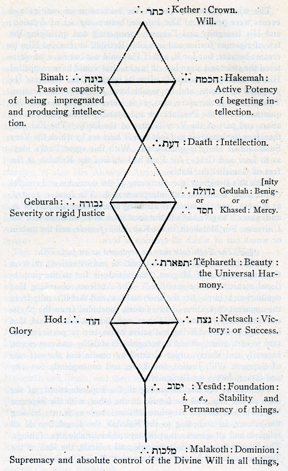 "The LIGHT," says the Book Omschim, or Introduction to the Kabala, "Supremest of all things, and most Lofty, and Limitless, and styled INFINITE, can be attained unto by no cogitation or speculation; and its VERY SELF is evidently withdrawn and removed beyond all intellection. It WAS, before all things whatever, produced, created, formed, and made by Emanation; and in it was neither Time, Head, or Beginning; since it always existed, and remains forever, without commencement or end." "Before the Emanations flowed forth, and created things were created, the Supreme Light was infinitely extended, and filled the whole WHERE; so that with reference to Light no vacuum could be affirmed, nor any unoccupied space; but the ALL was filled with that Light of the Infinite, thus extended, whereto in every regard was no end, inasmuch as nothing was, except that extended Light, which, with a certain single and simple equality, was everywhere like unto itself." AINSOPH is called Light, says the Introduction to the Sohar, because it is impossible to express it by any other word. To conceive of God as an actuality, and not as a mere non-substance or name, which involved non-existence, the Kabala, like the Egyptians, imagined Him to be "a most occult Light," AUR; not our material and visible Light, but the Substance out of which Light flows, the fire, as relative to its heat and flame. Of this Light or Ether, the Sun was to the Tsabeans the only manifestation or out-shining, and as such it was worshipped, and not as the type of dominion and power. God was the Phōs Noēton, the Light cognizable only by the Intellect, the Light-Principle, the Light-Ether, from which souls emanate, and to which they return. Light, Fire, and Flame, with the Phnicians, were the sons of Kronos. They are the Trinity in the Chaldæan Oracles, the AOR of the Deity, manifested in flame, that issues out of the invisible Fire. In the first three Persian Amshaspands, Lords of LIGHT, FIRE, and SPLENDOR, we recognize the AOR, ZOHAR, and ZAYO, Light, Splendor, and Brightness, of the Kabalah. The first of these is termed AOR MUPALA, Wonderful or Hidden Light, unrevealed, undisplayed--which is KETHER, the first Emanation or Sephirah, the Will of Deity: the second is NESTAR, Concealed--which is HAKEMAH, the second Sephirah, or the Intellectual Potence of the Deity: and the third is METANOTSATS, coruscating--which is BINAH, the third Sephirah, or the intellectual producing capacity. In other words, they are THE VERY SUBSTANCE of light, in the Deity: Fire, which is that light, limited and furnished with attributes, so that it can be revealed, but yet remains unrevealed, and its splendor or out-shining, or the light that goes out from the fire. Masonry is a search after Light. That search leads us directly back, as you see, to the Kabalah. In that ancient and little understood medley of absurdity and philosophy, the Initiate will find the source of many doctrines; and may in time come to understand the Hermetic philosophers, the Alchemists, all the Anti-papal Thinkers of the Middle Ages, and Emanuel Swedenborg. The Hansavati Rich, a celebrated Sanscrit Stanza, says: "He is Hansa (the Sun), dwelling in light; Vasu, the atmosphere dwelling in the firmament; the invoker of the gods (Agni), dwelling on the altar (i.e., the altar fire); the guest (of the worshipper), dwelling in the house (the domestic fire); the dweller amongst men (as consciousness); the dweller in the most excellent orb, (the Sun); the dweller in truth; the dweller in the sky (the air); born in the waters, in the rays of light, in the verity (of manifestation), in the Eastern mountains; the Truth (itself)." "In the beginning," says a Sanscrit hymn, "arose the Source of golden light. He was the only born Lord of all that is. He established the earth and the sky. Who is the God to Whom we shall offer our sacrifice?" "He who gives life, He who gives strength; Whose blessing all the bright gods desire; Whose shadow is immortality; Whose shadow is death; Who is the God, etc?" "He through Whom the sky is bright and the earth for us; He through Whom the Heaven was established, nay, the highest Heaven; He who measured out the light in the air; Who is the God, etc?" "He to Whom the Heaven and earth, standing firm by His will, look up trembling inwardly; He over Whom the rising sun shines forth; Who is the God, etc?" "Wherever the mighty water-clouds went, where they placed the seed and lit the fire, thence arose He Who is the only life of the bright gods; Who is the God, etc?" The WORD of God, said the Indian philosophy, is the universal 'and invisible Light, cognizable by the senses, that emits its blaze in the Sun, Moon, Planets, and other Stars. Philo calls it the "Universal Light," which loses a portion of its purity and splendor in descending from the intellectual to the sensible world, manifesting itself outwardly from the Deity; and the Kabalah represents that only so much of the Infinite Light flowed into the circular void prepared for creation within the Infinite Light and Wisdom, as could pass by a canal like a line or thread. The Sephiroth, emanating from the Deity, were the rays of His splendor. The Chaldæan Oracles said: "The intellect of the Generator, stirred to action, out-spoke, forming within itself, by intellection, universals of every possible form and fashion, which issued out, flowing forth from the One Source . . . For Deity, impersonated as Dominion, before fabricating the manifold Universe, posited an intellected and unchangeable universal, the impression of the form whereof goes forth through the Universe; and that Universe, formed and fashioned accordingly, becomes visibly beautified in infinitely varying types and forms, the Source and fountain whereof is one. . . . Intellectual conceptions and forms from the Generative source, succeeding each other, considered in relation to ever-progressing Time, and intimately partaking of THE PRIMAL ETHER or FIRE; but yet 