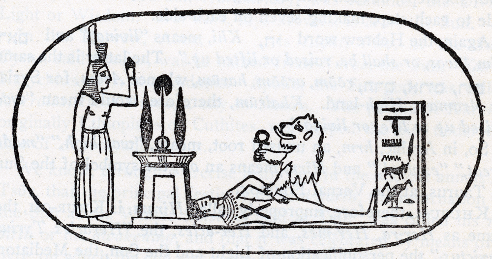 So, in Arabic, hrm, an unused root, meant, "was high," "made great," "exalted;" and Hîrm means an ox, the symbol of the Sun in Taurus, at the Vernal Equinox. KHURUM, therefore, improperly called Hiram, is KHUR-OM, the same as Her-ra, Her-mes, and Her-acles, the "Heracles Tyrius Invictus," the personification of Light and the Son, the Mediator, Redeemer, and Saviour. From the Egyptian word Ra came the Coptic Oūro, and the Hebrew Aūr, Light. Har-oeri, is Hor or Har, the chief or master. Hor is also heat; and hora, season or hour; and hence in several African dialects, as names of the Sun, Airo, Ayero, eer, uiro, ghurrah, and the like. The royal name rendered Pharaoh, was PHRA, that is, Pai-ra, the Sun. The legend of the contest between Hor-ra and Set, or Set-nu-bi, the same as Bar or Bal, is older than that of the strife between Osiris and Typhon; as old, at least, as the nineteenth dynasty. It is called in the Book of the Dead, "The day of the battle between Horus and Set." The later myth connects itself with Phœnicia and Syria. The body of OSIRIS went ashore at Gebal or Byblos, sixty miles above Tsūr. You will not fail to notice that in the name of each murderer of Khūrūm, that of the Evil God Bal is found. *** Har-oeri was the god of TIME, as well as of Life. The Egyptian legend was that the King of Byblos cut down the tamarisk-tree containing the body of OSIRIS, and made of it a column for his palace. Isis, employed in the palace, obtained possession of the column, took the body out of it, and carried it away. Apuleius describes her as "a beautiful female, over whose divine neck her long thick hair hung in graceful ringlets;" and in the procession female attendants, with ivory combs, seemed to dress and ornament the royal hair of the goddess. The palm-tree, and the lamp in the shape of a boat, appeared in the procession. If the symbol we are speaking of is not a mere modern invention, it is to these things it alludes. The identity of the legends is also confirmed by this hieroglyphic picture, copied from an ancient Egyptian monument, which may also enlighten you as to the Lion's grip and the Master's gavel.