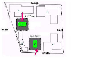 Typical floor plan of WTC tower (from http://www.civil.usyd.edu.au/wtc.htm#system ). The outside shape of the towers was almost square, but the inner core was more rectangular. Pictures from the early phases of construction photos show how the rectangular inner cores were oriented in the finished buildings ( http://www.GreatBuildings.com/cgi-bin/gbi.cgi/World_Trade_Center_Images.html/cid_wtc_mya_WTC_const.4.gbi ). Note that the north tower core was aligned east-west, and the south tower core was aligned north-south. This drawing shows the two WTC towers (black) and the paths of the attacking aircraft (red). Within the profile of each tower, the shape of the central core is shown by the green rectangle. WTC buildings 1 through 6 are numbered, WTC 7, north of 6, is not shown. With the central core bearing the weight of the building, the platters were tied together and stabilized by another set of steel columns at the outside rim, closely spaced and completely surrounding the structure. This resulting structure was so stable that the top of the towers swayed only three feet in a high wind. The architects called it a "tube-within-a-tube design." The TV experts told us that the joints between the floors and central columns melted (or the floor trusses, or the central columns, or the exterior columns, depending on the expert) and this caused the floor to collapse and fall onto the one below. This overloaded the lower floor, and the two of them fell onto the floor below, and so on like dominos (see http://news-info.wustl.edu/News/nrindex00/harmon.html or http://www.public-action.com/911/jmcm/harmon ). Back in the early 1970s when the World Trade Towers were built, the WTC was the tallest building that had ever been built in the history of the world. If we consider the architectural engineers, suppliers, builders, and city inspectors on the job, we can imagine they would be very careful to overbuild every aspect. If one bolt was calculated to serve, you can bet that three or four were used. If there was any doubt about the quality of a girder or steel beam, you can be sure it was rejected. After all, any failures would attract the attention of half the civilized world, and no corporation wants a reputation for that kind of stupidity — particularly if there are casualties. I do not know the exact specifications for the WTC, but I know in many trades (and some I've worked), a structural member must be physically capable of three times the maximum load that will ever be required of it (BreakingStrength = 3 x WorkingStrength). According to Engineering and Technical Handbook by McNeese and Hoag, Prentice Hall, 3rd printing, September 1959: page 47 (Table) Safety Factors of Various Materials, the mandatory safety factor for structural steel is 600%. That is, a steel structure may be rated for a load of only one sixth the actual theoretical limit. Given that none of those floors was holding a grand piano sale or an elephant convention that day, it is unlikely that any of them were loaded to the maximum. Thus, any of the floors should have been capable of supporting more than its own weight plus the two floors above it. I suspect the WTC was engineered for safer margins than the average railroad bridge, and the actual load on each floor was less than 1/6 the BreakingStrength. The platters were constructed of webs of steel trusses. Radial trusses ran from the perimeter of the floor to the central columns, and concentric rings of trusses connected the radial trusses, forming a pattern like a spider web (see http://news.bbc.co.uk/olmedia/1540000/images/_1540044_world_trade_structure300.gif or http://public-action.com/911/jmcm/BBCNews/DOCS/1540044w.gif ). Where the radial trusses connected with the central columns, I imagine the joints looked like the big bolted flanges where girders meet on a bridge — inches thick bolts tying the beams into the columns. In order to weaken those joints, a fire would have to heat the bolts or the flanges to the point where the bolts fell apart or tore through the steel. But here is another thing that gives me problems — all the joints between the platter and the central columns would have to be heated at the same rate in order to collapse at the same time — and at the same rate as the joints with the outer columns on all sides — else one side of the platter would fall, damaging the floor below and making obvious distortions in the skin of the building, or throwing the top of the tower off balance and to one side. |