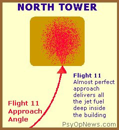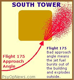 But there were no irregularities in the fall of those buildings. They fell almost as perfectly as a deck of cards in the hands of a magician doing an aerial shuffle. Images cached from PsyOpNews: The Split-Second Error This is particularly worrisome since the first plane struck one side of the north tower, causing (you would think) a weakening on that side where the exterior columns were struck, and a more intense fire on that side than on the other side. And the second plane struck near the corner of the south tower at an angle that caused much of the fuel to spew out the windows on the adjacent side (see http://www.eionews.addr.com/images/wtc/southtowerpath.jpg or http://public-action.com/911/jmcm/southtowerpath.jpg ). Yet the south tower also collapsed in perfect symmetry, spewing dust in all directions like a Fourth of July sparkler burning to the ground ( http://public-action.com/911/jmcm/usyd/DOCS/dustfountain.jpg ). This symmetry of descent is even more remarkable in the south tower because in the first moments of the collapse, the top 20 floors of the south tower tilted over to the south ( http://news.bbc.co.uk/olmedia/1535000/images/_1538563_thecollapseap150.jpg or http://www.public-action.com/911/jmcm/BBCNews/DOCS/1538563t.jpg ).