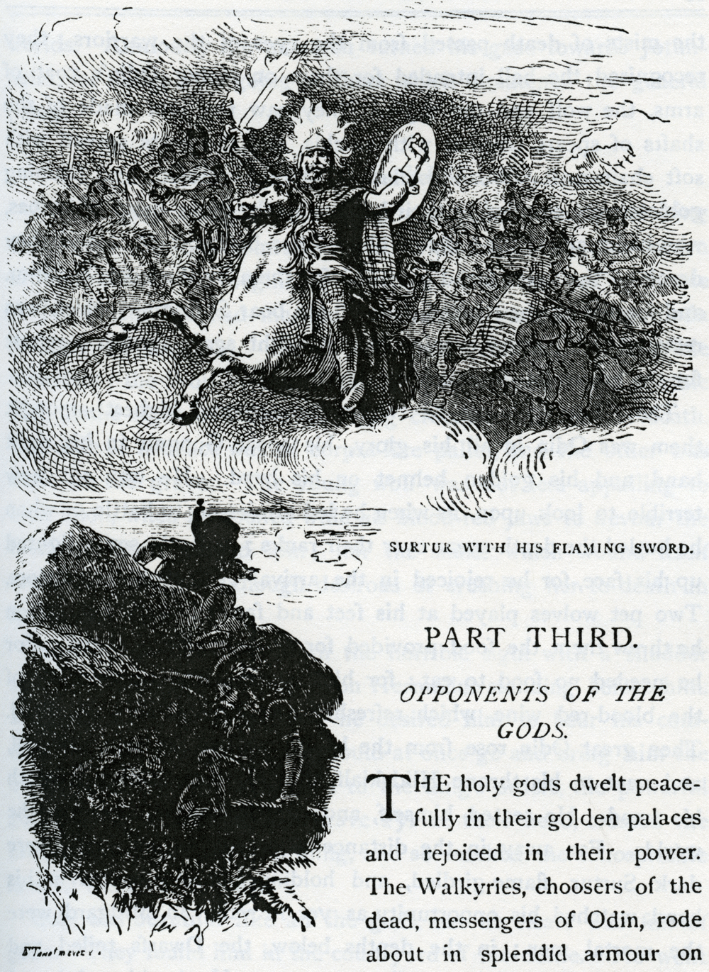 Surtur With His Flaming Sword PART THIRD: OPPONENTS OF THE GODS Loki and his kindred ― 53, The giants ― 55, Muspel and his sons ― 56, Surtur ― 57 The holy gods dwelt peacefully in their golden palaces and rejoiced in their power. The Walkyries, choosers of the dead, messengers of Odin, rode about in splendid armour on their white horses. They bore the hero-spirits they had taken from bloody battlefields back with them to Asgard. On reaching the grove Glasir, they dismounted from their horses, and led the heroes under the shade of its golden foliage to Walhalla. There the mists of death passed from the eyes of the warriors; they recognised the hall intended for them on seeing Odin’s coat of arms, the wolf and the eagle. They saw the roof made of the shafts of spears covered with shields, and the seats spread with soft chainmail. Weapons flashed as they entered, and foaming goblets were emptied in their honour by the great band of heroes, who had reached the halls of blessedness before them. And they drank of the sweet mead provided for them by the goat Heidrun, and feasted on the roasted flesh of the boar Sährimnir, which was restored to life every evening, that it might again furnish a repast for the heroes on the following day. The ruling gods sat on twelve thrones, and highest amongst them was Odin in all his glory, his spear Gungnir in his right hand, and his golden helmet on his head. He was not now terrible to look upon, as when he led armies on to battle or when he hurled the death-spear over their ranks; a gentle smile lighted up his face, for he rejoiced in the arrival of the noble warriors. Two pet wolves played at his feet and fawned upon him, when he threw them the food provided for himself at the board. For he needed no food to eat; for him it was sufficient to drink of the blood-red wine, which refreshed and strengthened his mind. Then great Odin rose from the board, walked through the hall, and went to his throne Hlidskialf, all Asgard trembling beneath his tread. He seated himself, and gazed thoughtfully over the worlds. Far away in the distance gleamed Muspelheim, where dark Surtur, flame-girdled, and holding his fiery sword in his hand, watched his opportunity as yet in vain; in Midgard were the mortal men; in the depths below, the Dwarfs toiled and laboured. The mighty god’s two ravens, Hugin (thought) and Munin (memory), flew quickly up to him; they perched one on his right shoulder and the other on his left, and whispered in his ears the secrets they had heard during their flight through the worlds. Anxiously the monarch turned his gaze towards Jotunheim, for things were going on there which threatened the general peace. LOKI AND HIS KINDRED In the grey twilight enveloping the giants’ world, the king recognised his old comrade Loki, with whom he had sworn brotherhood at the beginning of time. Loki had set up house in Jotunheim and had married the dreadful giantess Angurboda (bringer of anguish). They had three children, all horrible monsters: the Wolf Fenris, the Snake Jörmungander, and terrible Hel, at the sight of whom all living creatures stiffened in death. One side of her face was of corpse-like pallor, and the other was dark as the grave. The young wolf was not less appalling to look upon, when he opened wide his blood-red jaws to devour the food his father offered him; nor the snake which wound itself round Angurboda as though desirous of crushing her to death in its coils. Allfather turned away from the horrible sight with a shudder of disgust, and saw his bright son Hermodur standing before him. Pointing down at Jotunheim, he desired him to bear his commands to the gods, that they should at once go and bring him the brood of giants. In obedience to the king’s orders, the powerful gods at once arose, and with brave Tyr at their head, crossed the bridge Bifröst and the river Ifing, and so reached the inhospitable land of the Hrimthurses. Loki was beautiful like all the gods, but his heart was full of guile. They found him in the court-yard of his castle. He went on playing with his monstrous progeny, and took no notice of the messengers, until they approached quite close to him, and made known the commands of Odin. He would have refused to obey, but strong Tyr shook his fist threateningly, upon which he gave way, and followed them to Asgard, accompanied by his children. He was immediately brought before the king’s throne. Terrible Hel grew visibly more gigantic, lightnings flashed from her deepset eyes, and she stretched out her arms as though she wished to destroy the great Father. At the same moment Jörmungander reared her head in the air, till she resembled a twisted column, gnashed her jaws and emitted a venomous foam, before which the very gods shrank back. But the king seized both monsters in his powerful arms, and flung them far out of Asgard into immeasurable space. Hel sank nine days’ journey past the bogs, morasses, and rocks of ice in Nifelheim, past the river Giöll and down into the kingdom of Helheim, which was allotted to her, and where she henceforth ruled over the dead. But the Snake fell into the ocean that flows round Midgard. Hidden in its depths, and unseen by gods and men, she was to grow, until, after having twisted herself into innumerable coils, her ugly head should touch the tip of her tail. Then, at last, when the twilight of the gods (the judgment of the gods) should come to pass, she was again to rise, and help to bring about the destruction of the worlds. When the Wolf saw his playfellows flung out of Asgard, he began to howl so loud, that his voice was heard over in Jotunheim. Yet he did not venture to resist, and great Tyr bore him away from before the face of the angry Father, away from the heavenly towers, to where the hills of Asgard slope towards Midgard; there he brought him food every day. Odin still remained on Hlidskialf, thinking of all, caring for all. The gods stood silently around him; but Loki