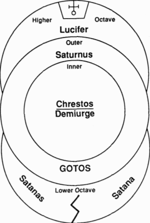 As has been intimated, the outer and ruling aspect of the planetary genius is that of Saturn with all its previously outlined characteristics. A part of this is the egregore of the FS itself—the GOTOS. Deep within there is, however, the creative solar spark called the Chrestos-Principle. [54] These two aspects can work harmoniously and consciously together in the controlled sphere of Saturn. This enlightened state is facilitated especially when harmony with the higher octave of the planet, Lucifer—the Light-Bearer—is concentrated on. The higher octave is also harmonized with the planetary spirit of Uranus, with which Saturn works for the current aeonic transformation. In the lower octave, Saturn is connected to the Satanic force. This is the power of rebellion, adversity, and death, all of which are absolutely necessary to man's path of attainment—to his Becoming. However, this purely "Satanic" aspect can be ultimately as dangerous and destructive to consciousness as is the self-obliterating power of the Sun. The Saturnian brother must remain concentrated on the higher octave in order to remain fully conscious and independent (consistent with the Luciferian Principle), and not fall into the lower to become a mere tool of the Demiurge.