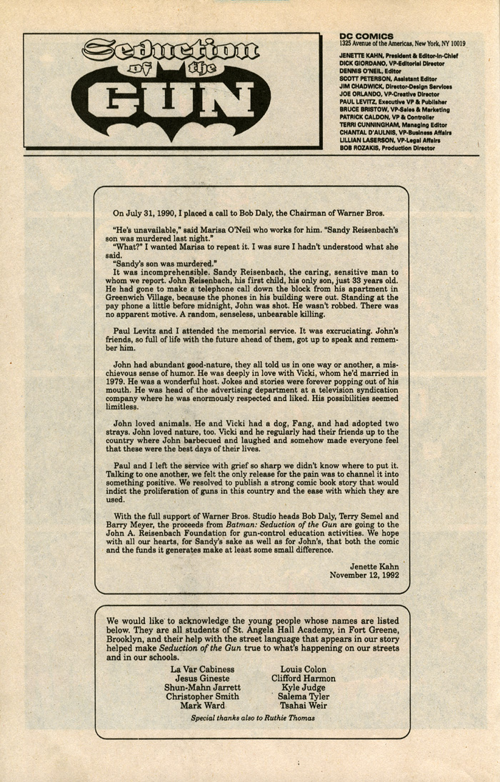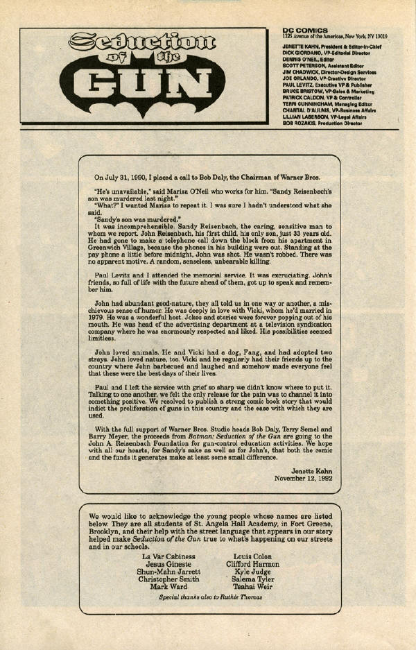 Seduction of the GUN DC Comics, 1325 Avenue of the Americas, New York, NY 10019 JENETTE KAHN, President & Editor-in-Chief; DICK GIORDANO, VP-Editorial Director, DENNIS O'NEIL, Editor; SCOTT PETERSON, Assistant Editor; JIM CHADWICK, Director-Design Services; JOE ORLANDO, VP-Creative Director; PAUL LEVITZ, Executive VP & Publisher; BRUCE BRISTOW, VP-Sales & Marketing; PATRICK CALDON, VP & Controller; TERRI CUNNINGHAM, Managing Editor; CHANTAL D'AULNIS, VP-Business Affairs; LILLIAN LABERSON, VP-Legal Affairs; BOB ROZAKIS, Production Director On July 31, 1990, I placed a call to Bob Daly, the Chairman of Warner Bros. "He's unavailable," said Marisa O'Neil who works for him. "Sandy Reisenbach's son was murdered last night." "What?" I wanted Marisa to repeat it. I was sure I hadn't understood what she said. "Sandy's son was murdered." It was incomprehensible. Sandy Reisenbach, the caring, sensitive man to whom we report. John Reisenbach, his first child, his only son, just 33 years old. He had gone to make a telephone call down the block from his apartment in Greenwich Village, because the phones in his building were out. Standing at the pay phone a little before midnight, John was shot. He wasn't robbed. There was no apparent motive. A random, senseless, unbearable killing. Paul Levitz and I attended the memorial service. It was excruciating. John's friends, so full of life with the future ahead of them, got up to speak and remember him. John had abundant good-nature, they all told us in one way or another, a mischievous sense of humor. He was deeply in love with Vicki, whom he'd married in 1979. He was a wonderful host. Jokes and stores were forever popping out of his mouth. He was head of the advertising department at a television syndication company where he was enormously respected and liked. His possibilities seemed limitless. John loved animals. He and Vicki had a dog, Fang, and had adopted two strays. John loved nature, too. Vicki and he regularly had their friends up to the country where John barbecued and laughed and somehow made everyone feel that these were the best days of their lives. Paul and I left the service with grief so sharp we didn't know where to put it. Talking to one another, we felt the only release for the pain was to channel it into something positive. We resolved to publish a strong comic book story that would indict the proliferation of guns in this country and the ease with which they are used. With the full support of Warner Bros. Studio heads Bob Daly, Terry Sernel and Barry Meyer, the proceeds from Batman: Seduction of the Gun are going to the John A. Reisenbach Foundation for gun-control education activities. We hope with all our hearts, for Sandy's sake as well as for John's, that both the comic and the funds it generates make at least some small difference. Jenette Kahn, November 12, 1992 We would like to acknowledge the young people whose names are listed below. They are all students of St. Angela Hall Academy, in Fort Greene, Brooklyn, and their help with the street language that appears in our story helped make Seduction of the Gun true to what's happening on our streets and in our schools. La Var Cabiness, Jesus Gineste, Shun-Mahn Jarrett, Christopher Smith, Mark Ward, Louis Colon, Clifford Harmon, Kyle Judge, Salema Tyler, Tsahai Weir Special thanks also to Ruthie Thomas |