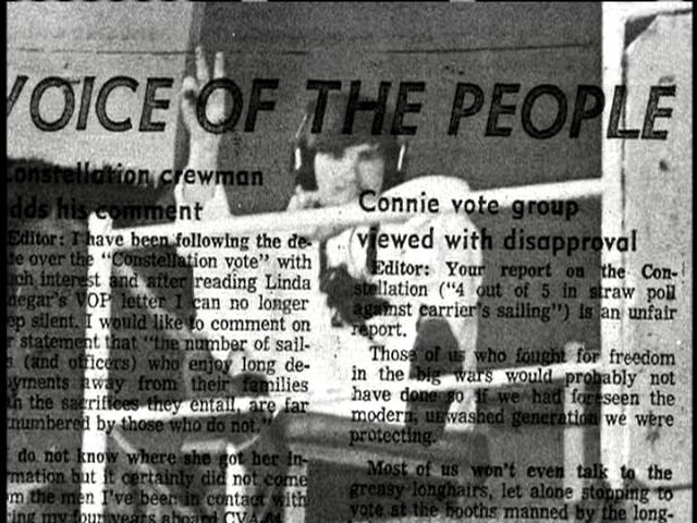 Balloting in a straw vote The Captain of the ship says, "Well I know there are a lot of people on the ship who don't want to go, but the military is full of malcontents." HENRY KISSINGER: We believe that ... peace is at hand. TOM BERNARD, U.S. AIR FORCE SECURITY SERVICE: You know, the peace that was at hand quickly disappeared after the re-election ... |