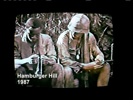 the memory and reality of the GI anti-war movement was being rewritten. HAMBURGER HILL, 1987: They love everybody back there. Cats, dogs, niggers, spics -- they're real fond of the gook back home if you all can believe that. They love everybody but you. JERRY LEMBCKE, U.S. ARMY, SOCIOLOGY PROFESSOR: The typical story of a spat-upon vet is arriving at the San Francisco Airport ... where he is met by demonstrators ... |