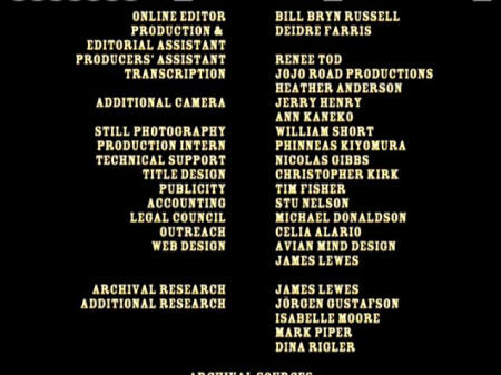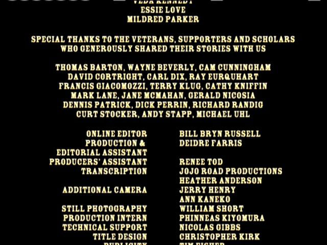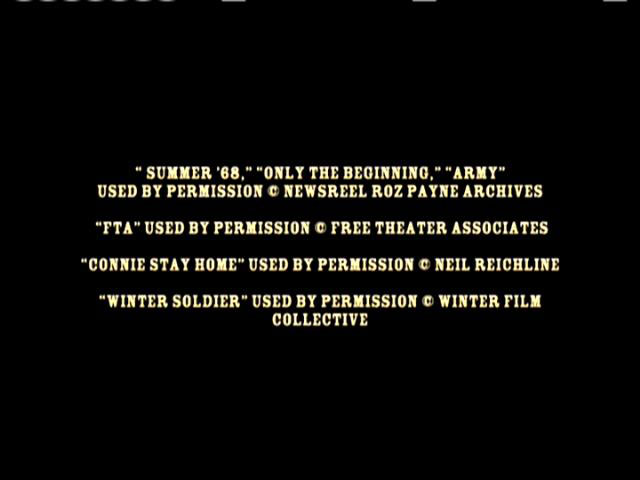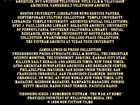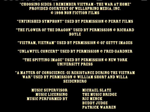 BILL BRYN RUSSELL PUBLICITY: TIM FISHER ARCHIVAL SOURCES: JUDY BABINSKI, ANDY BELL, JAMES BLACKWELL, DAVE CLINE, KENNETH CLOKE, DAVID CORTRIGHT PAPERS, ROBERT CHRISTGAU, CAM CUNNINGHAM, EMORY DOUGLAS, JOHN FILO, BOB FIORE, BOB FITCH, GEOFFREY ITHEN, JAMES JERNIGAN, O.T. JOHNSON, MARK JURY, ALDEN KIMBRO, BART LUBOW, DAVID STONE MARTIN, RON MCMAHAN, ELIZABETH MOCK, CAROLYN MUGAR, FRANCINE PARKER, ALAN POGUE, YOLANDA RETTER, GEORGE SCHMIDT, BILL STREET, WALLACE TERRY, ERIK WEBBE ABC NEWS VIDEOSOURCE, BBC WORLDWIDE AMERICAS INC., DEPT. OF DEFENSE, DEPT. OF THE ARMY, KPIX-TV, KRON-TV, NATIONAL ARCHIVES AND RECORDS ADMINISTRATION, NEWSREEL, ROZ PAYNE ARCHIVES, SAN FRANCISCO BAY AREA TELEVISION ARCHIVES, SVT-SWEDISH TELEVISION, UCLA FILM & TELEVISION ARCHIVES, VANDERBILT TELEVISION ARCHIVE BOSTON UNIVERSITY, LIBERATION NEWS SERVICE PAPERS, CONTEMPORARY CULTURE COLLECTION - TEMPLE UNIVERSITY, LIBRARIES - TEMPLE UNIVERSITY, ARCHIVES SPECIAL COLLECTIONS, SFSU J. PAUL LEONARD LIBRARY, SOLDATEN ARCHIVE, UNIVERSITY OF PENNSYLVANIA, SOUTHERN CALIFORNIA LIBRARY - SOCIAL RESEARCH, NEWSFILM - UNIVERSITY OF SOUTH CAROLINE COLLECTION, SWARTHMORE COLLEGE - PEACE COLLECTION, THE VIETNAM ARCHIVE AT TEXAS TECH UNIVERSITY JAMES LEWES GI PRESS COLLECTION UNDERGROUND PRESS SYNDICATE/BELL & HOWELL, THE CHRISTIAN SCIENCE MONITOR, THE ECONOMIST, ESQUIRE, KANSAS CITY STAR, KILLEEN DAILY HERALD, LOS ANGELES TIMES, NEW YORK TIMES, AFRO-AMERICAN NEWSPAPERS ARCHIVES AND RESEARCH CENTER, PHILADELPHIA INQUIRER, SAN DIEGO UNION-TRIBUNE, SAN FRANCISCO CHRONICLE, SAN FRANCISCO EXAMINER, HOUSTON CHRONICLE, SAN FRANCISCO EXAMINER, HOUSTON CHRONICLE, UN WIRE, AP.WIDE WORLD, NEW YORK TIMES, LIFE MAGAZINE, REDBOOK MAGAZINE, RAMPARTS MAGAZINE, CORBIS, GETTY IMAGES, RADIO FIRST TERMER, PACIFICA RADIO "CHOOSING SIDES: I REMEMBER VIETNAM -- THE WAR AT HOME" PROVIDED COURTESY OF WELLSPRING MEDIA, INC. © 1998 NON FICTION FILMS "UNFINISHED