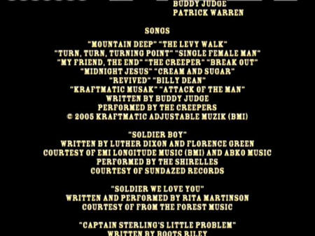 SUGAR" "REVIVED" "BILLY DEAN" "KRAFTMATIC MUSAK" "ATTACK OF THE MAN" "SOLDIER BOY" WRITTEN BY LUTHER DIXON AND FLORENCE GREEN, COURTESY OF EMI LONGITUDE MUSIC (BMI) AND ABKO MUSIC, PERFORMED BY THE SHIRELLES COURTESY OF SUNDAZED RECORDS "SOLDER WE LOVE YOU" WRITTEN AND PERFORMED BY RITA MARTINSON, COURTESY OF FROM THE FOREST MUSIC "CAPTAIN STERLING'S LITTLE PROBLEM" WRITTEN BY BOOTS RILEY, PERFORMED BY THE COUP, COURTESY OF FIELD NEGRO MUSIC |