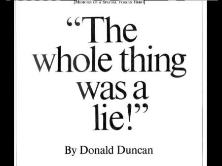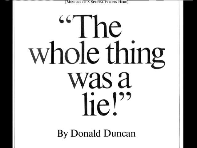 The patrol was led by Americans but there were Vietnamese ARVN there, and they were turned over to ARVN and ARVN used the old-fashioned methods of interrogation, force, torture. That was pretty common practice. I tell you, as bad as that treatment was, the cynicism that attached to it was the part that was really sickening, I thought, anathema to everything I'd been taught, everything I learned, everything I grew up with. This is just not the way we treated human beings. And it was all done for the good of the cause, I guess. [Ramparts -- "I quit!"] ["The whole thing was a lie!" By Donald Duncan] |