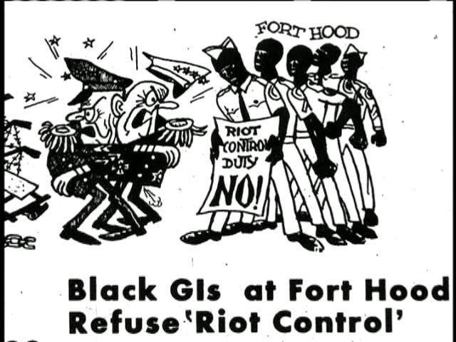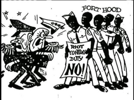 and about what was happening with the war. FORT HOOD NARRATOR: As the meeting stretched into the night, Fort Hood's commanding general showed up to talk to the GIs. ELDER HALIM GULLAHBEMI, U.S. ARMY: "You see, I'm just a two-star general -- let me go talk to my boss, and I'll have an answer for you in the morning." So we just relaxed, you know, went to sleep ... all of a sudden, crack up side the head. They cracked me upside the head, you know. What the hell is going on? MPs all around us, man. They came at us with bayonets. |