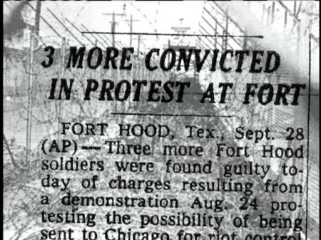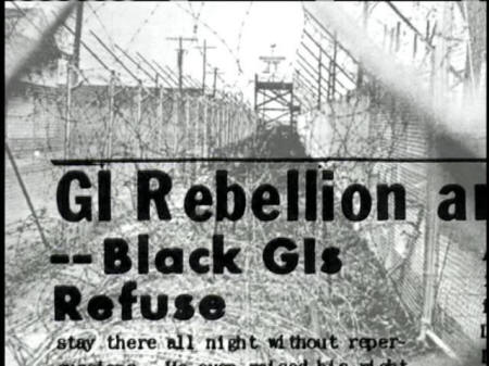 I got cut. I got hit right here with a bayonet. And then every now and then they opened this formation up, and a group of MPs come in and grab a brother, and take him back in the back, and beat the shit out of him. He was screaming in the back. Damn! [5 FOES OF RIOT DUTY CONVICTED BY ARMY] Black GIs Refuse 3 MORE CONVICTED IN PROTEST AT FORT More GI's Resist |
