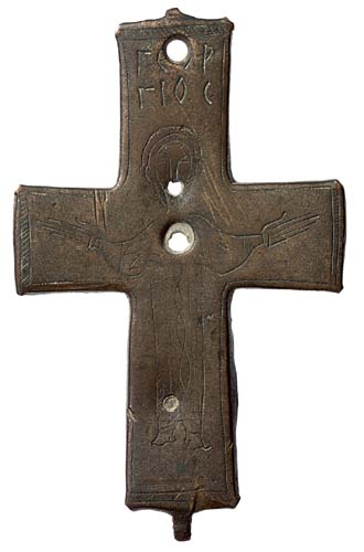 Bronze Byzantine reliquary cross (c.9th to 12th century), height 87mm, depicting St. George, as indicated by the inscription at top, with outstretched arms and dressed in a robe decorated with geometric patterns. Estimated value US $475. Image © 1999, Harlan J. Berk Ltd. |