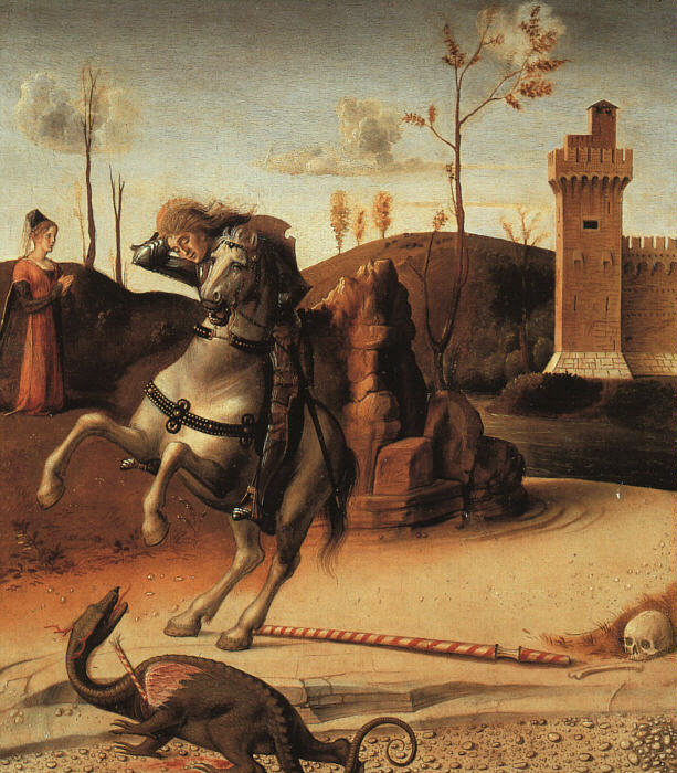 St. George fighting the dragon (40 x 36cm), the left panel of the Pesaro altarpiece by Giovanni Bellini, dating c.1471-74, at Musei Civici, Pesaro. Image from Web Gallery of Art. |