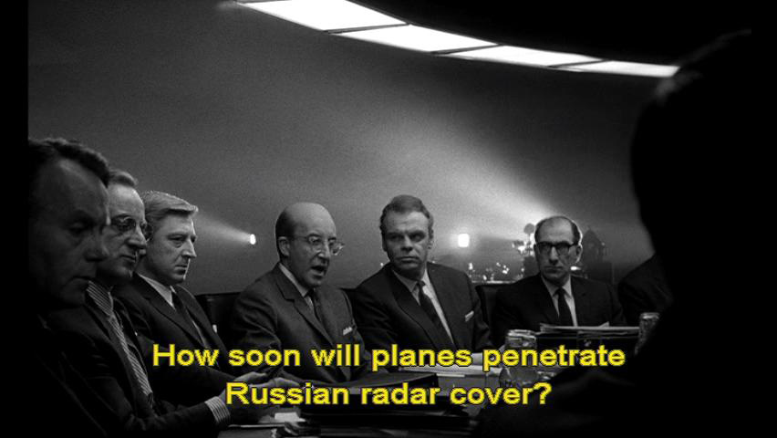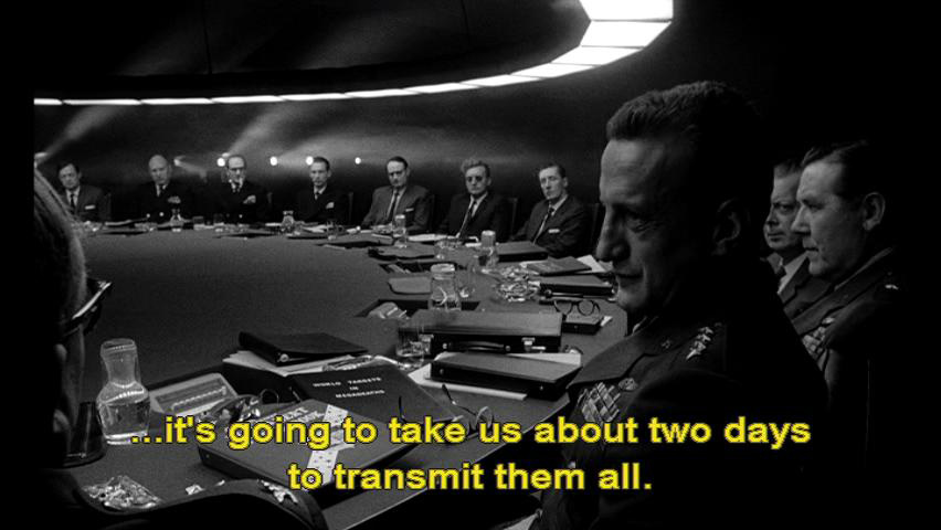 ... it's going to take us about two days to transmit them all. President: How soon will planes penetrate Russian radar cover? General Turgidson: Eighteen minutes from now. President: Are you in contact with Ripper? General Turgidson: No, sir. General Ripper sealed off the base, and cut off communications.