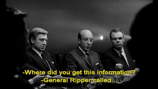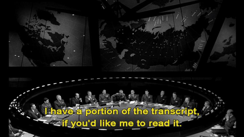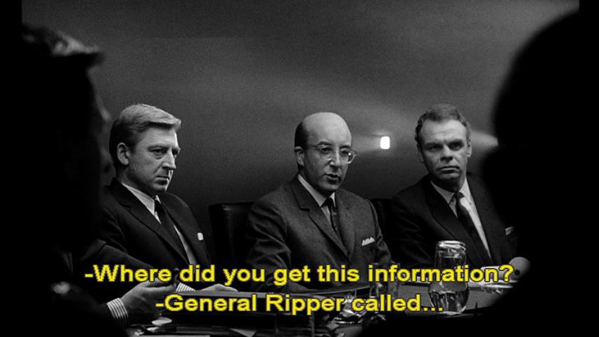 President: Where did you get this information? General Turgidson: General Ripper called ... ... Strategic Air Command headquarters shortly after he issued the go code. I have a portion of the transcript, if you'd like me to read it. President: Read it.