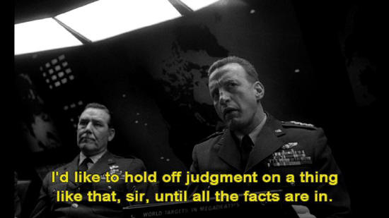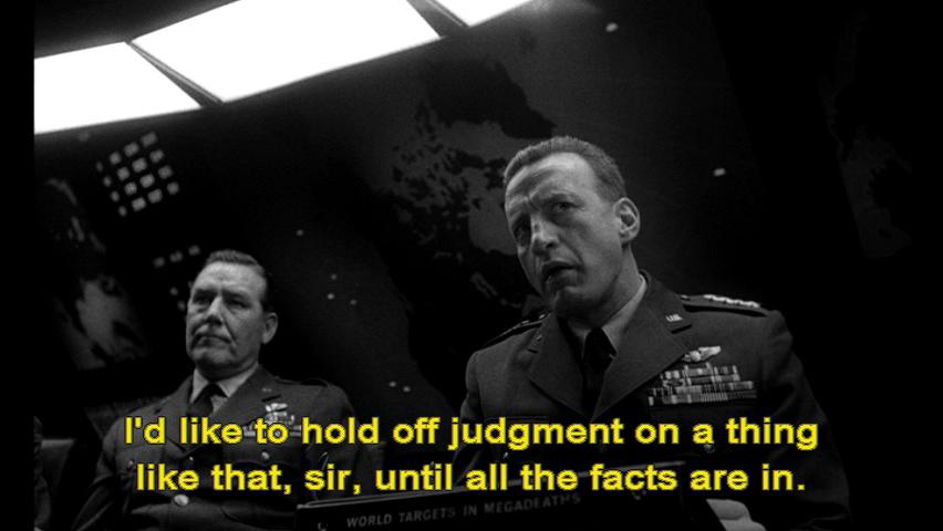 Then he hung up. We're still trying to figure out the meaning of that last phrase. President: There's nothing to figure out. This man is obviously a psychotic. General Turgidson: I'd like to hold off judgment on a thing like that, sir, until all the facts are in.