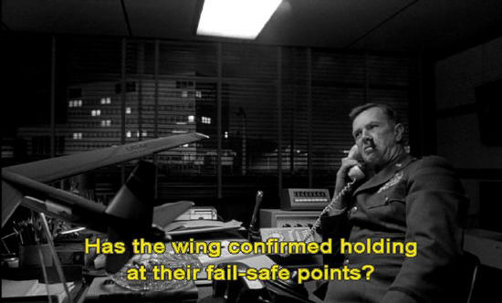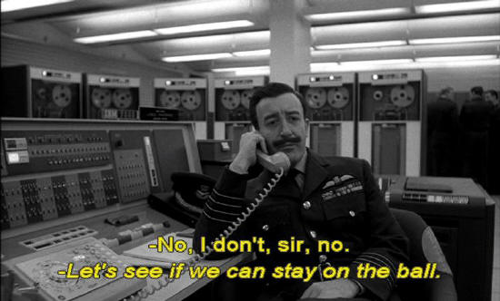 General Jack Ripper: You don't think I'd ask unless it was pretty damned important, do you? Capt. Mandrake: No, I don't, sir, no. General Jack Ripper: Let's see if we can stay on the ball. General Jack Ripper: Has the wing confirmed holding at their fail-safe points? Capt. Mandrake: Yes, sir. The confirmations have all just come in.
