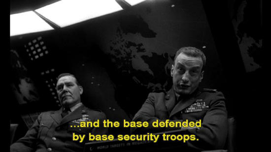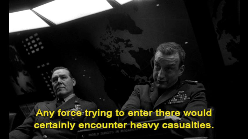 General Turgidson: Mr. President, if I may advise. Under a condition red, it is standard procedure that the base be sealed off ... ... and the base defended by base security troops. Any force trying to enter there would certainly encounter heavy casualties.