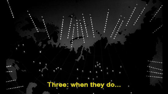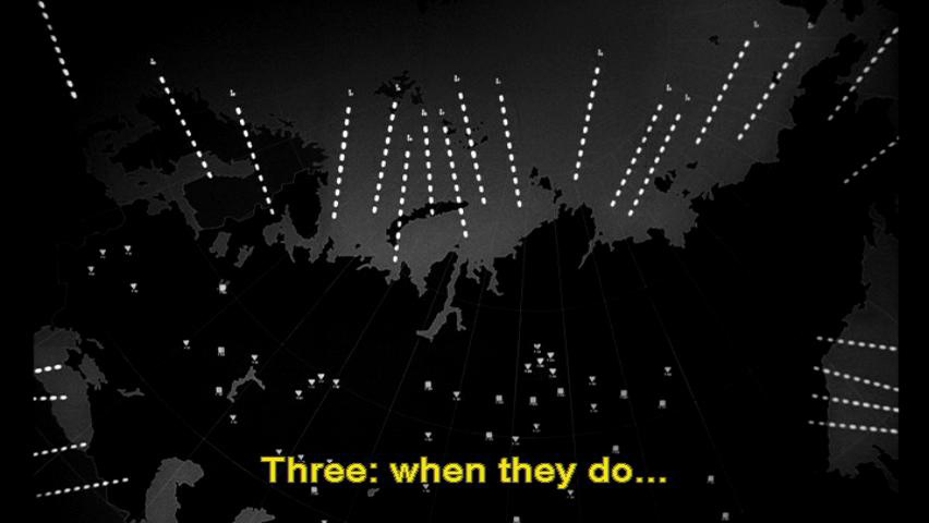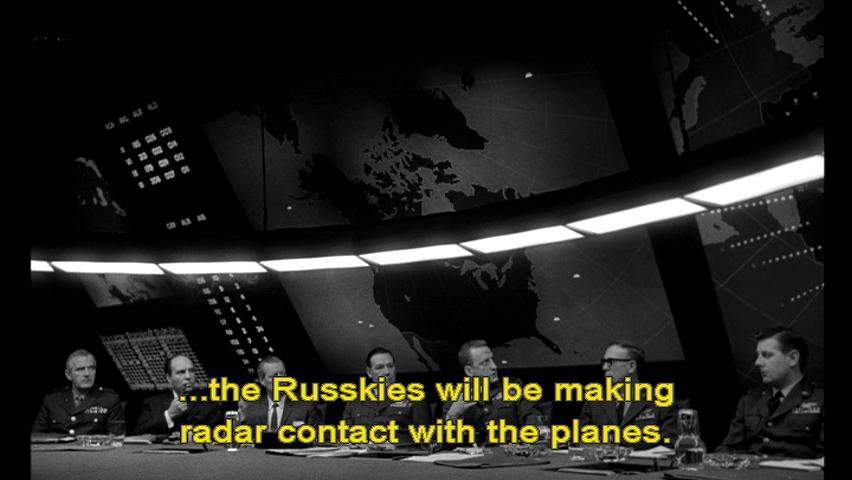 ... are quickly being reduced to a very low order of probability. Two: in less than 15 minutes from now ... ... the Russkies will be making radar contact with the planes. Three: when they do ...