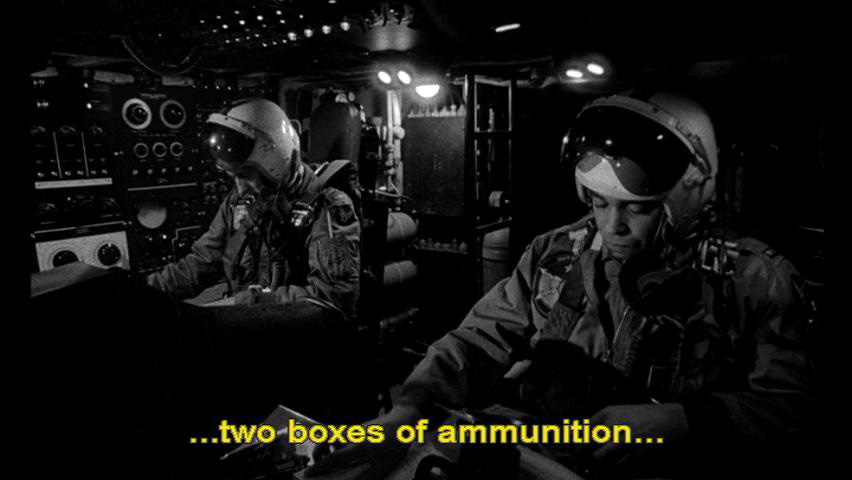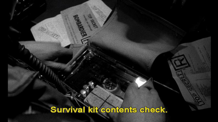 Major Kong: Survival kit contents check. In them, you will find one .45 caliber automatic ... ... two boxes of ammunition ... ... four days' concentrated emergency rations ...