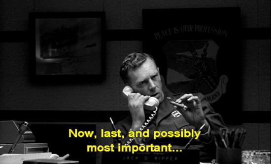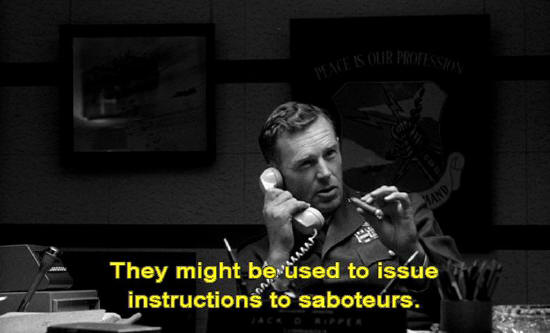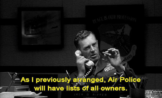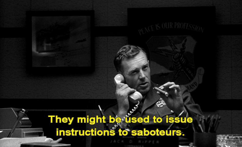 General Jack Ripper: Now, last, and possibly most important ... ... I want all privately-owned radios to be immediately impounded. They might be used to issue instructions to saboteurs. As I previously arranged, Air Police will have lists of all owners.