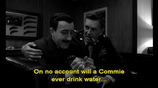 Captain Mandrake: Well, no, I can't say I have, Jack. General Jack Ripper: Vodka. That's what they drink, isn't it? Never water. Captain Mandrake: Well, I believe that's what they drink, Jack, yes. General Jack Ripper: On no account will a Commie ever drink water ...