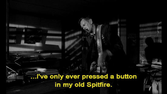General Jack Ripper: Come over here and help me with this belt. Captain Mandrake: I haven't had very much experience ... ... you know, with those sort of machines, Jack ... ... I've only ever pressed a button in my old Spitfire.