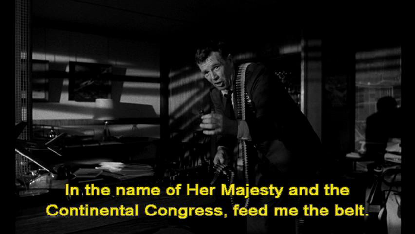 General Jack Ripper: In the name of Her Majesty and the Continental Congress, feed me the belt. Captain Mandrake: Jack, I'd love to come, but what's happened, you see ... ... the string in my leg's gone. General Jack Ripper: The what? Captain Mandrake: The string. I never told you ...