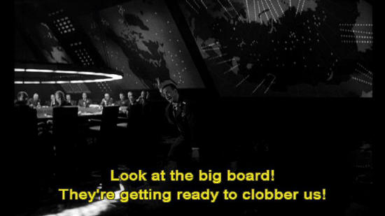 General Turgidson: It's a Commie trick! We're wasting valuable time! Look at the big board! They're getting ready to clobber us! President: But this is absolute madness. Why should you build such a thing?