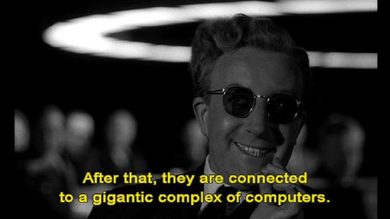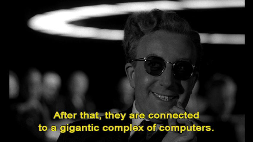 After that, they are connected to a gigantic complex of computers. Now, then: a specific and clearly-defined set of circumstances ... ... under which the bombs are to be exploded ... ... is programmed into a tape memory bank.