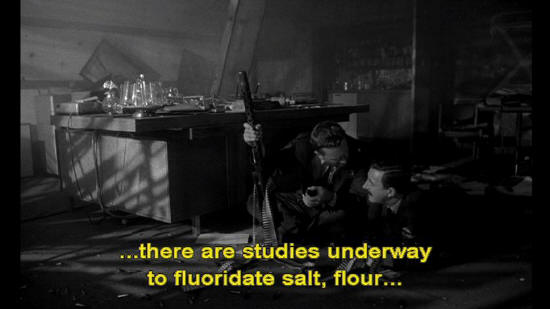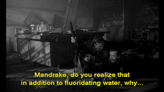 Mandrake, do you realize that in addition to fluoridating water, why ... ... there are studies underway to fluoridate salt, flour ... ... fruit juices, soup, sugar, milk, ice cream? Ice cream, Mandrake.