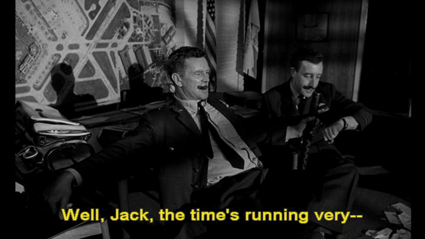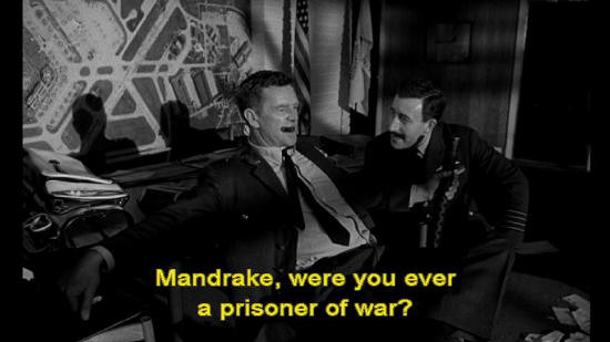 ... that there's nothing wrong with my bodily fluids. Not a thing, Jackie. General Jack Ripper: Mandrake, were you ever a prisoner of war? Captain Mandrake: Well, Jack, the time's running very -- What? General Jack Ripper: Were you ever a prisoner of war?