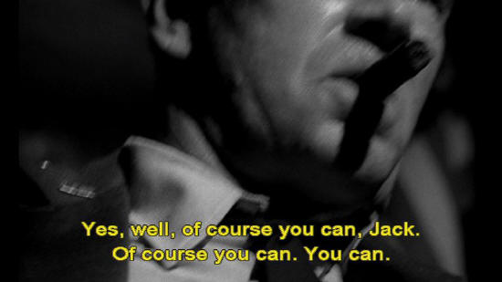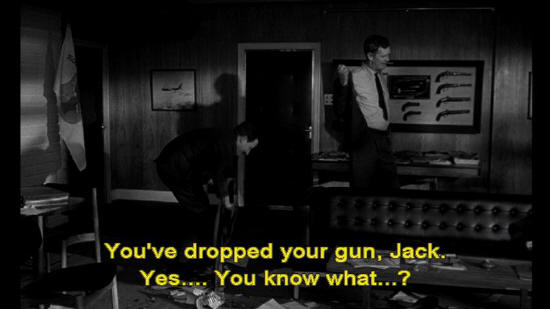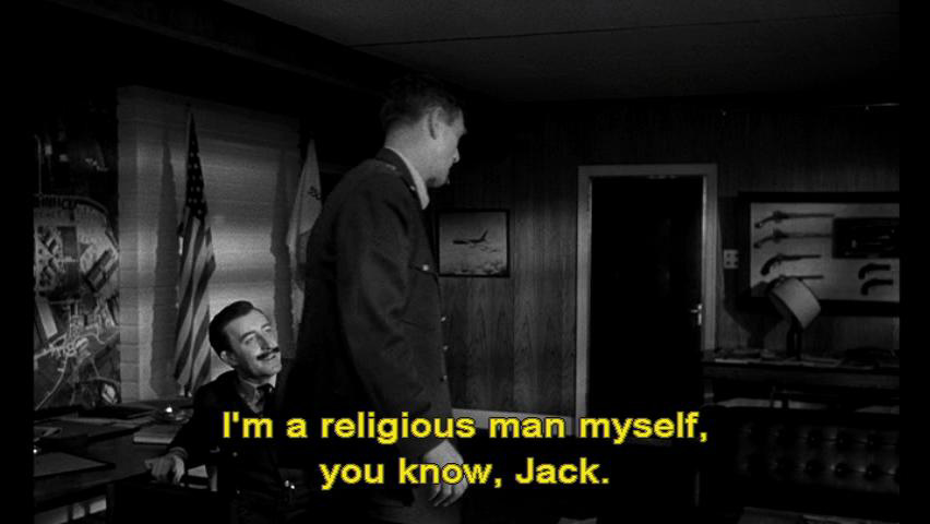 Captain Mandrake: Yes, well, of course you can, Jack. Of course you can. You can. I'm a religious man myself, you know, Jack. I believe in all that sort of thing and I'm hoping, you know, Jack ... You've dropped your gun, Jack. Yes ... You know what ...?