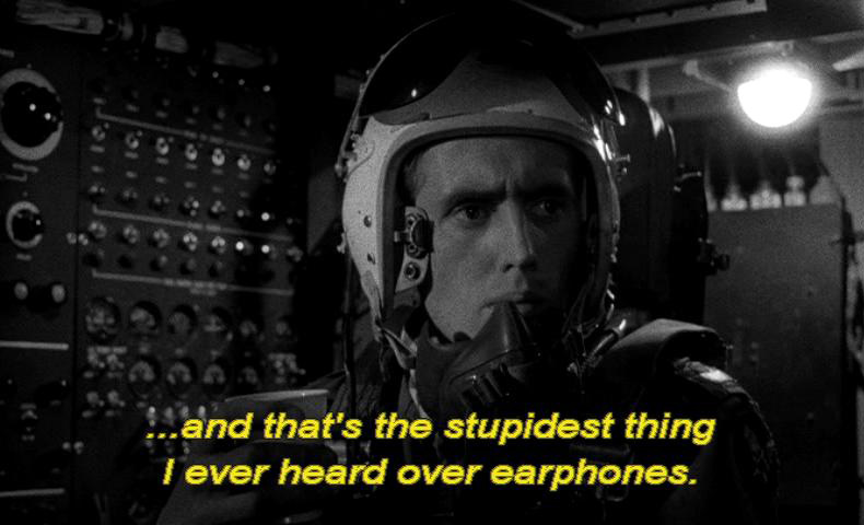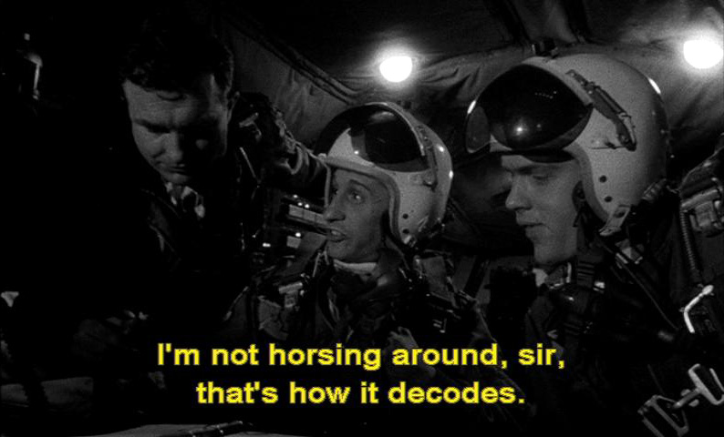 ... that I don't want no horsing around on the airplane? Goldie: I'm not horsing around, sir, that's how it decodes. Major Kong: Well, I've been to one world fair, a picnic and a rodeo ... ... and that's the stupidest thing I ever heard over earphones.
