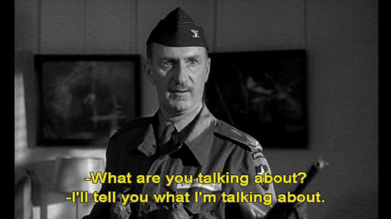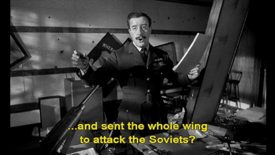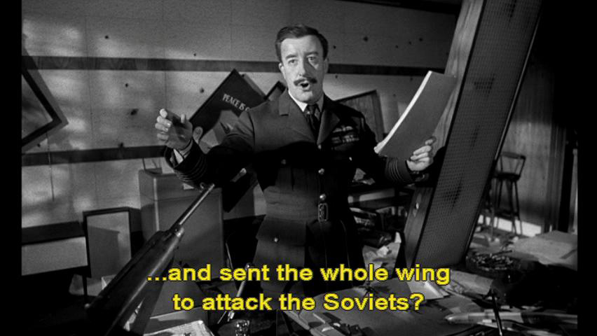 ... and sent the whole wing to attack the Soviets? Colonel: What are you talking about? Captain Mandrake: I'll tell you what I'm talking about. I'm gonna pick up this red telephone, which is connected to SAC ... ... and I hope --