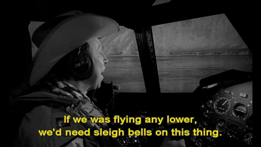 Major Kong: Well, boys, we got three engines out ... .. we got more holes in us than a horse trader's mule .. ..the radio is gone and we're leaking fuel. If we was flying any lower, we'd need sleigh bells on this thing.