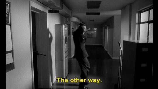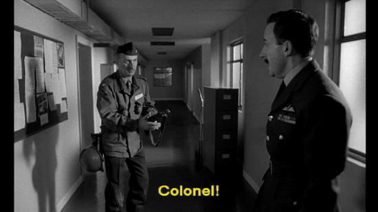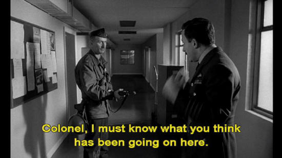 Colonel: The other way. Captain Mandrake: Where are you taking me? Colonel: To the main gate. Captain Mandrake: Colonel! Colonel, I must know what you think has been going on here.