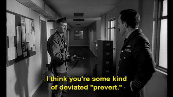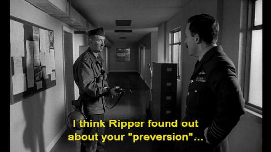 Colonel: You wanna know what I think? Captain Mandrake: Yes. Colonel: I think you're some kind of deviated "prevert." I think Ripper found out about your "preversion" ... ... and that you were organizing some kind of mutiny of preverts. Now, move!